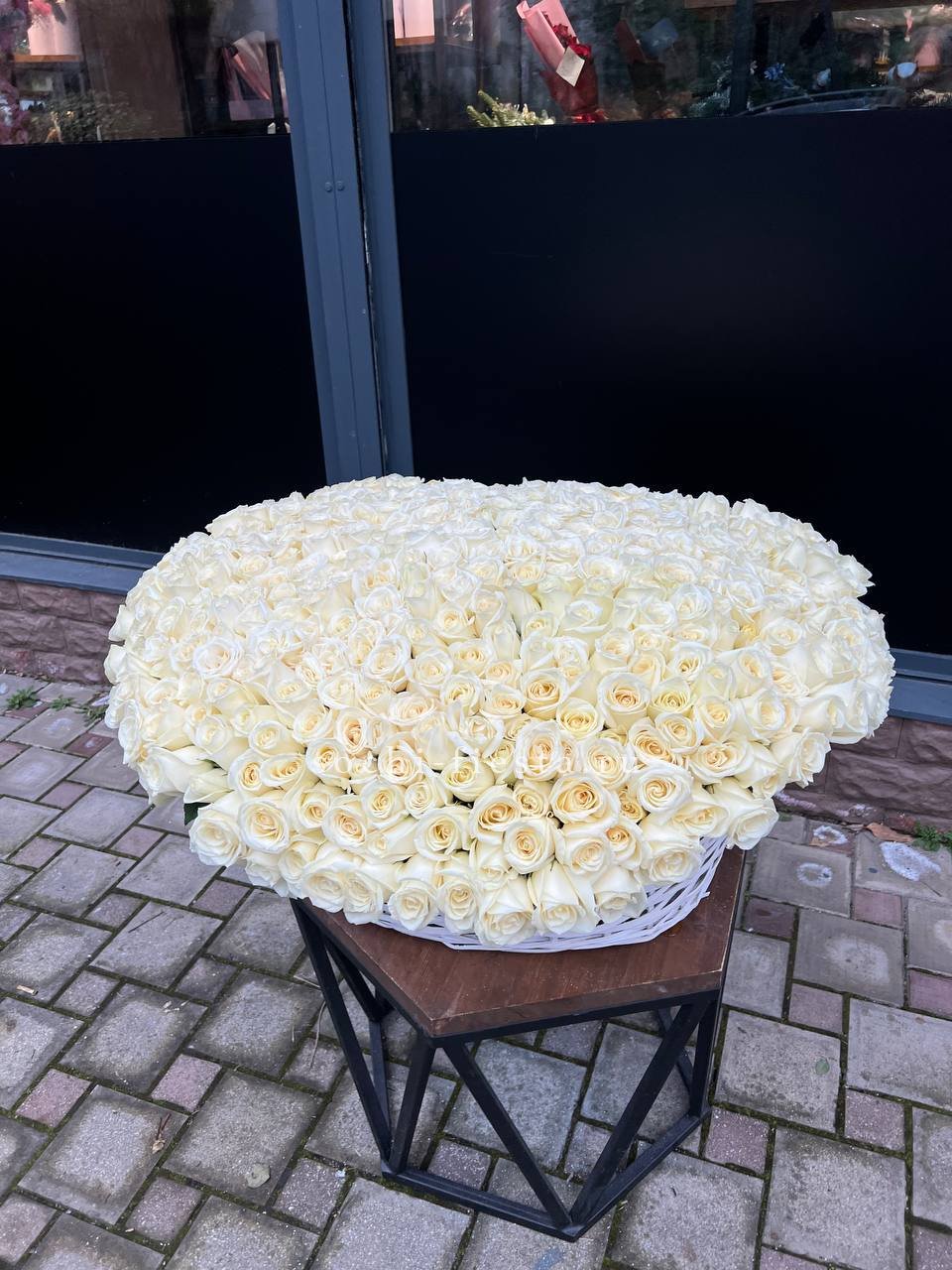 Пятьсот пять алых бутонов собраны в масштабную корзину, которая заполняет пространство цветом и объемом. Это композиция, которая говорит сама за себя своим количеством и насыщенностью.