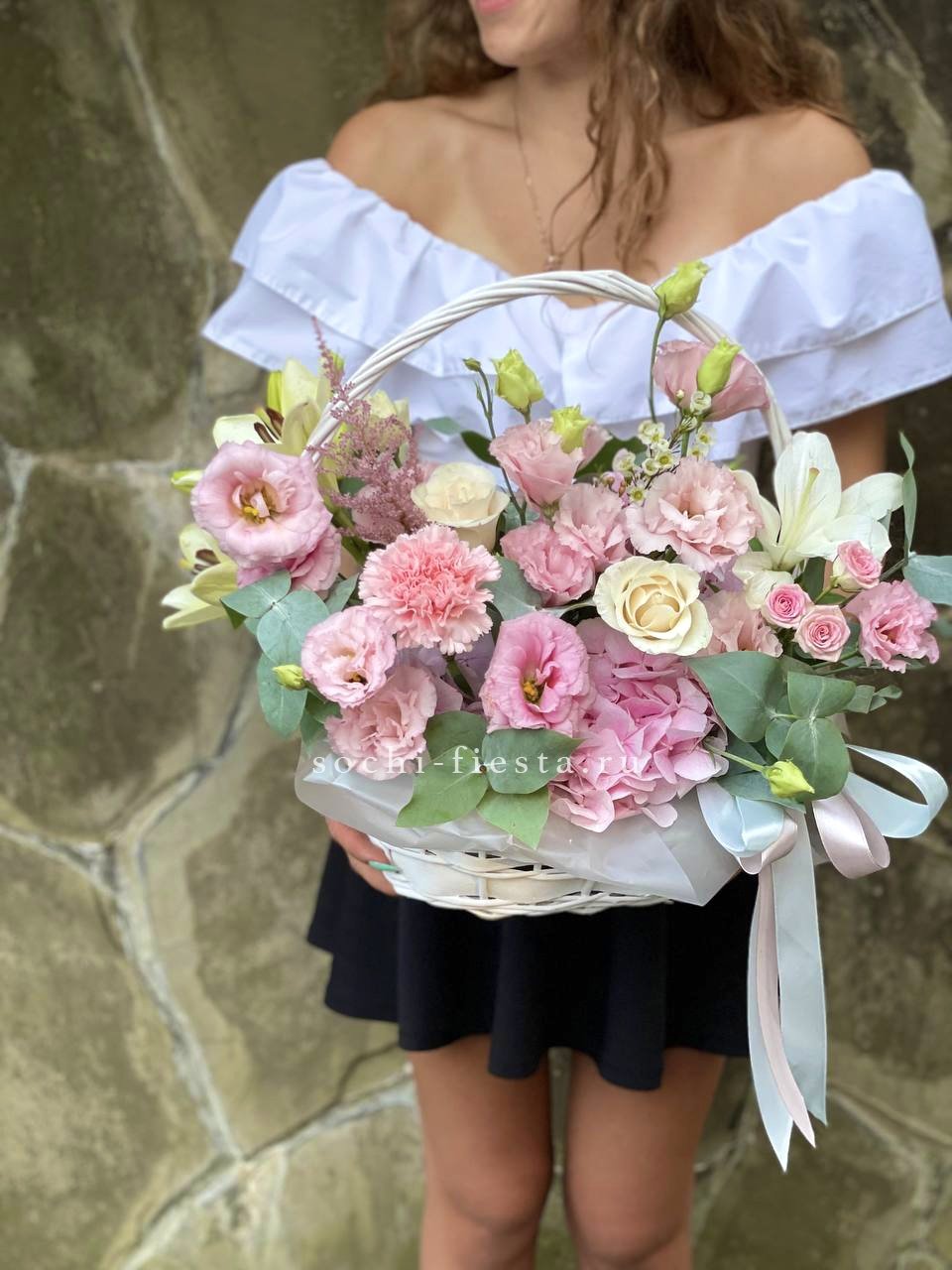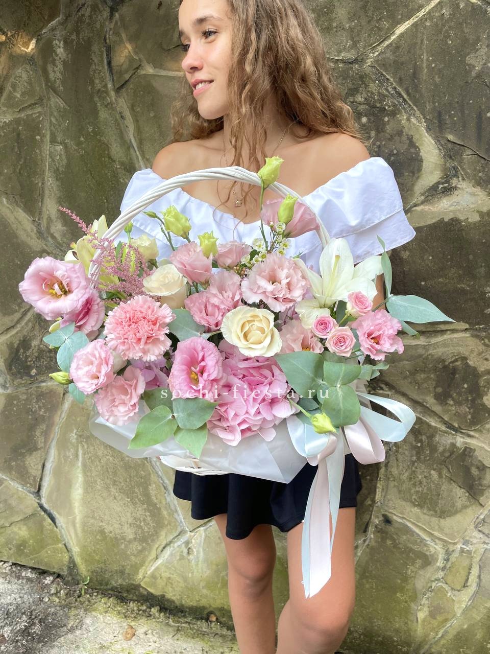 маттиола, гортензии, кустовые розы, розовые розы в корзине.