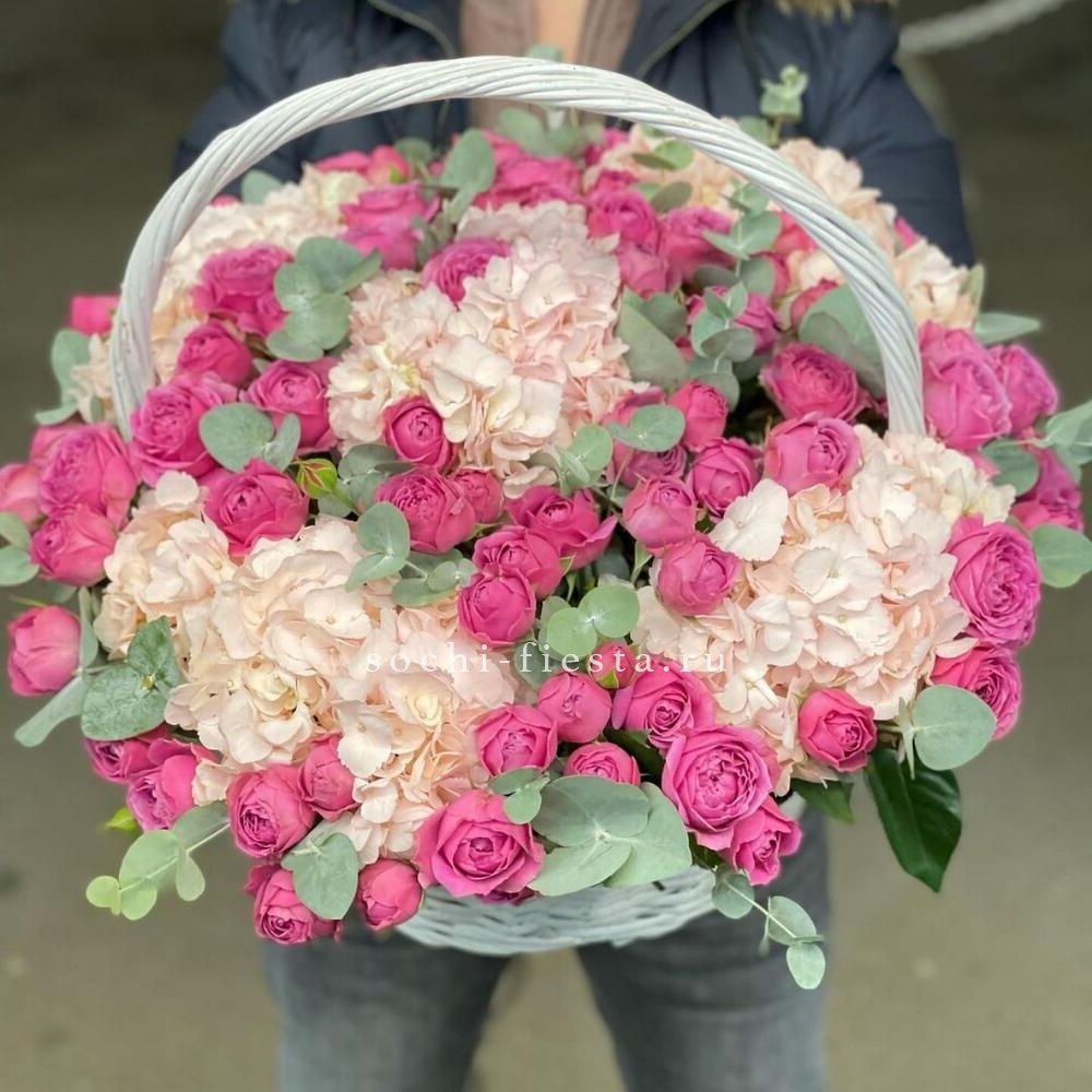роза розовая (оттенки от нежно-розового до фуксии по наличию) французские - 25шт, эвкалипт, корзина.