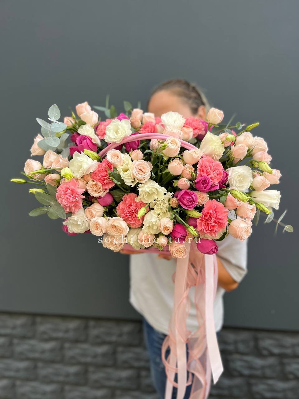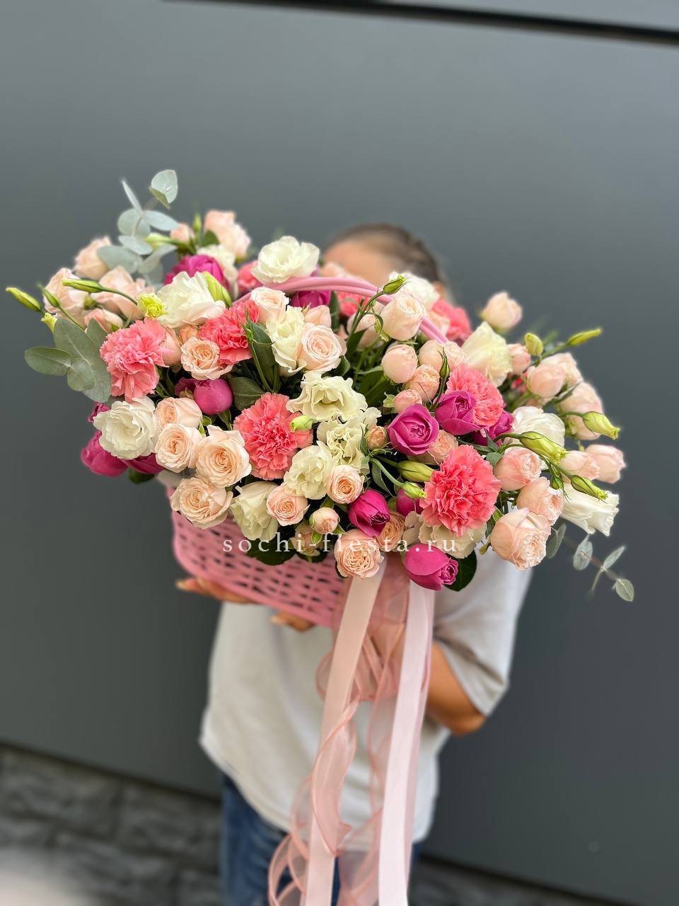 Плотная сферическая форма из пышных бутонов создаёт объёмную композицию в плетёной корзине. Ветки эвкалипта добавляют воздушности между головками цветов. Классическое решение для яркого события или знакового дня в жизни близкого человека.