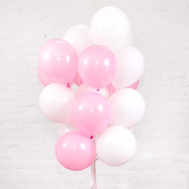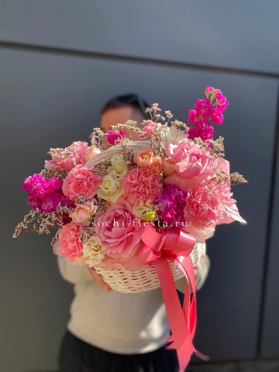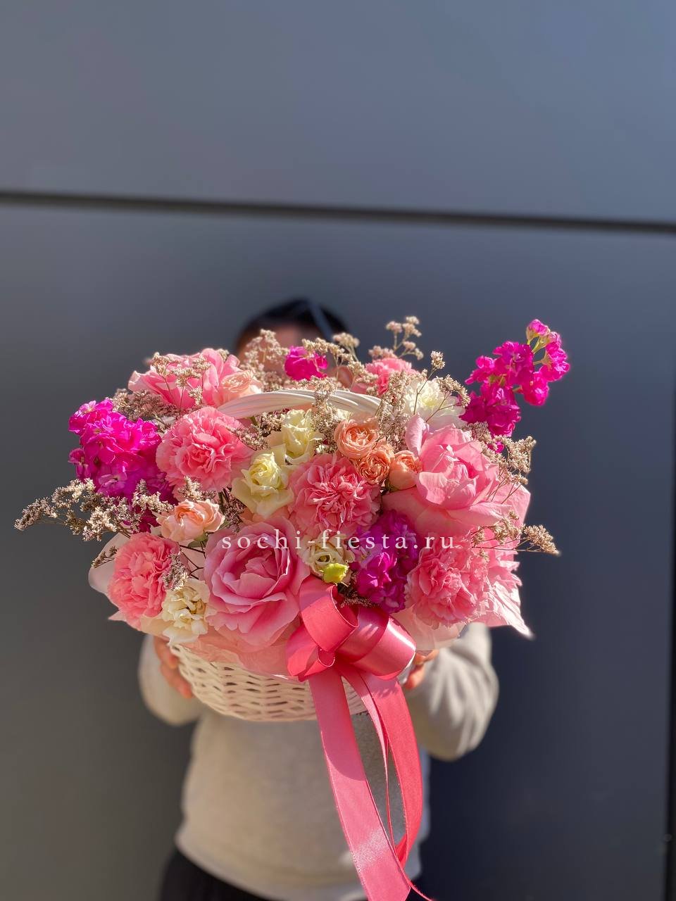 Плетёная корзина вмещает густую композицию из белых и розовых бутонов. Хризантемы и розы перемежаются с соцветиями гортензии, а статица добавляет воздушности между крупными головками цветов.