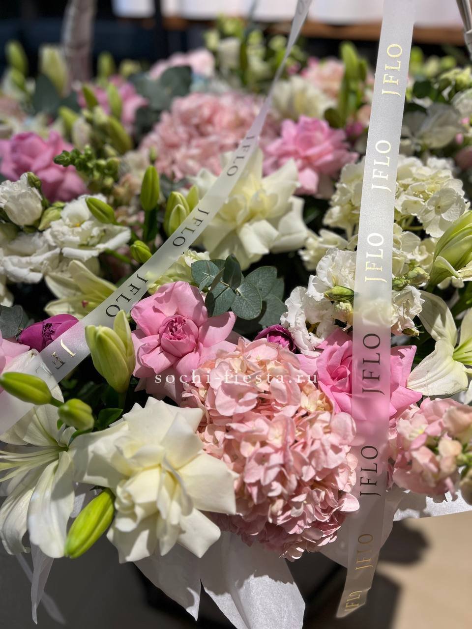 лилии, гортензия, антиринум, мисти баблс, розы, эустома, корзина гигант.