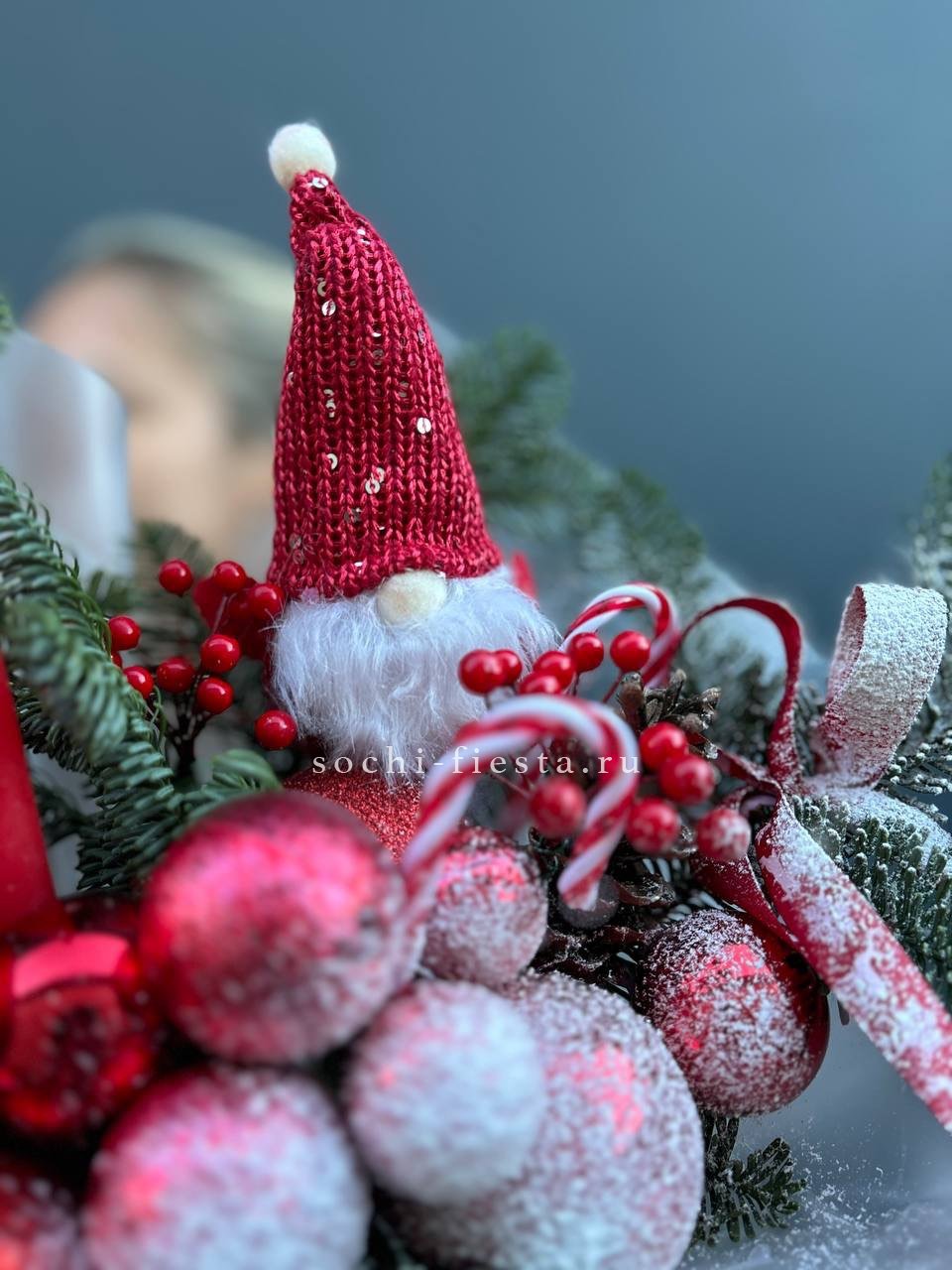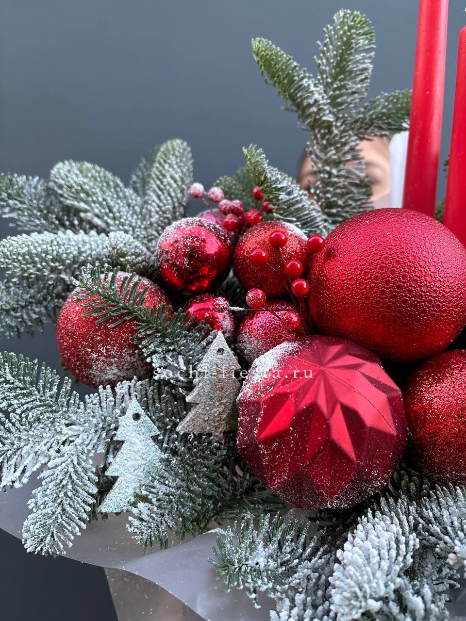 Красные акценты в игрушках и декоре задают яркий тон всей композиции. Свечи и пышная хвоя нобилиса выстраивают праздничный ритм с насыщенной цветовой подачей.