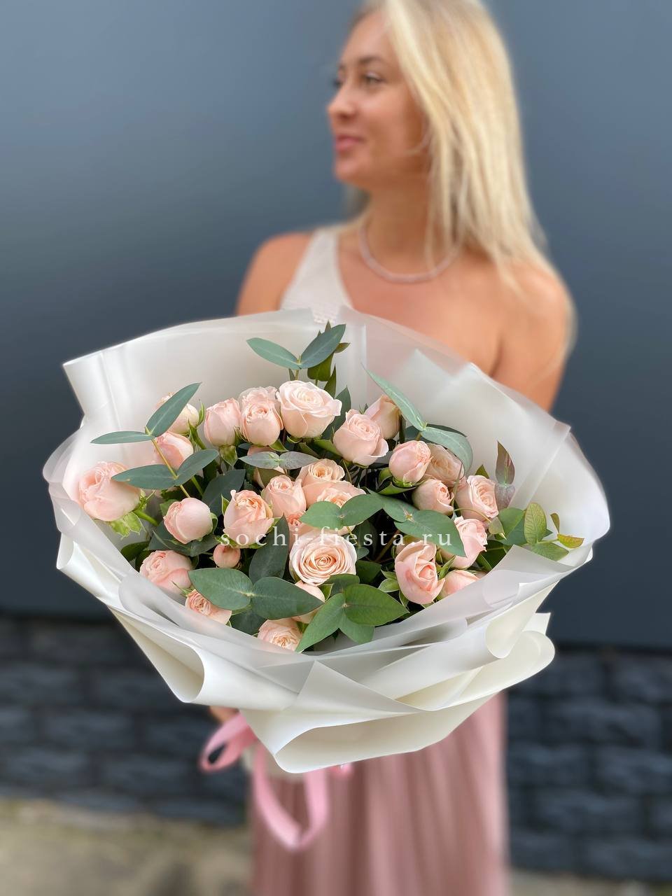Состав: 27 кремовых роз, лента, дизайнерская пленка или крафт