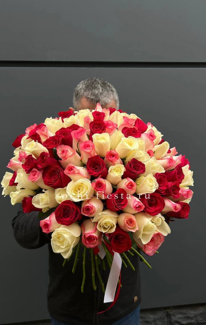 Длинные стебли и крупные бутоны в палитре микс создают букет с графичным силуэтом. Сто одна роза выстраивается в плотную композицию с выразительной вертикалью.