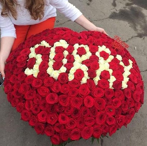 Красный и белый чередуются в свободном ритме, образуя живую композицию. Пятьдесят пять бутонов создают объёмное цветовое полотно, где каждый оттенок усиливает звучание другого.