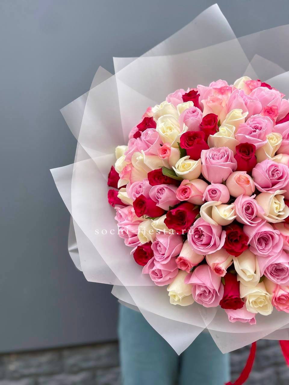 101 роза разноцветных оттенков, лента, упаковка на выбор.