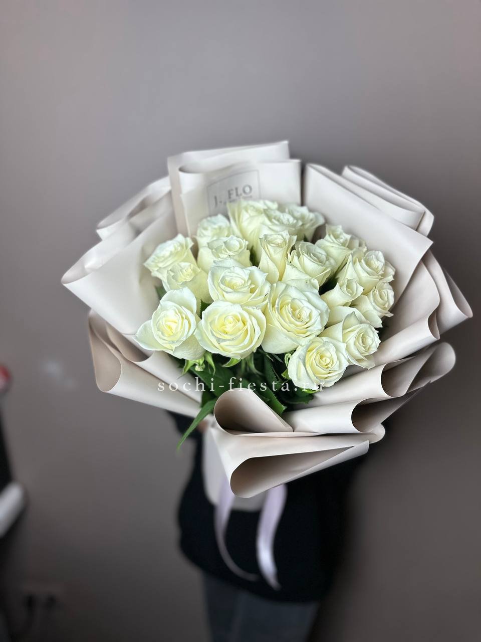 Белоснежные лепестки создают ощущение света и простора. Двадцать один бутон образует воздушную композицию с мягким переходом оттенков. Букет дарит момент тишины и покоя.