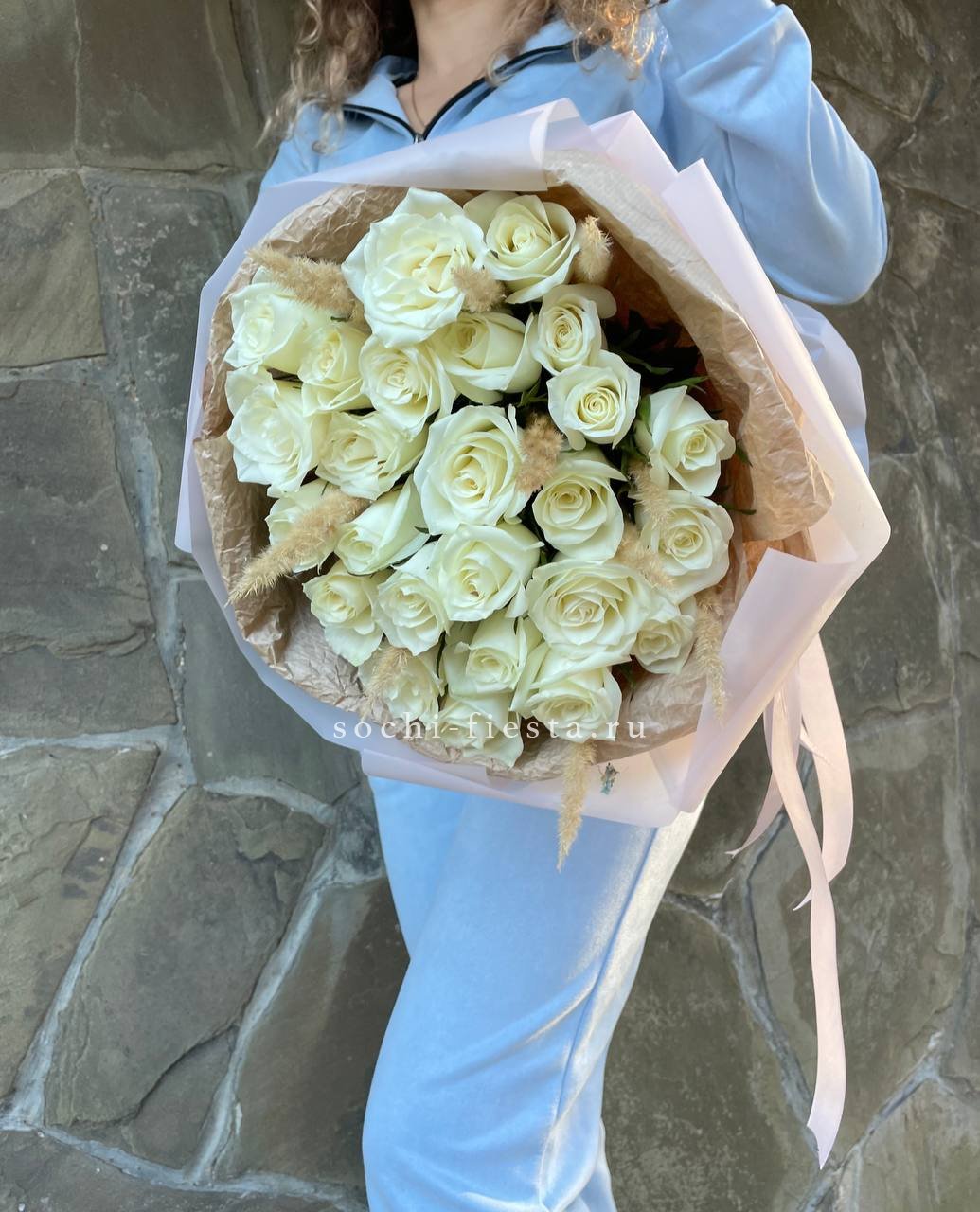 25 белых роз, сухоцветы, дизайнерская упаковка.