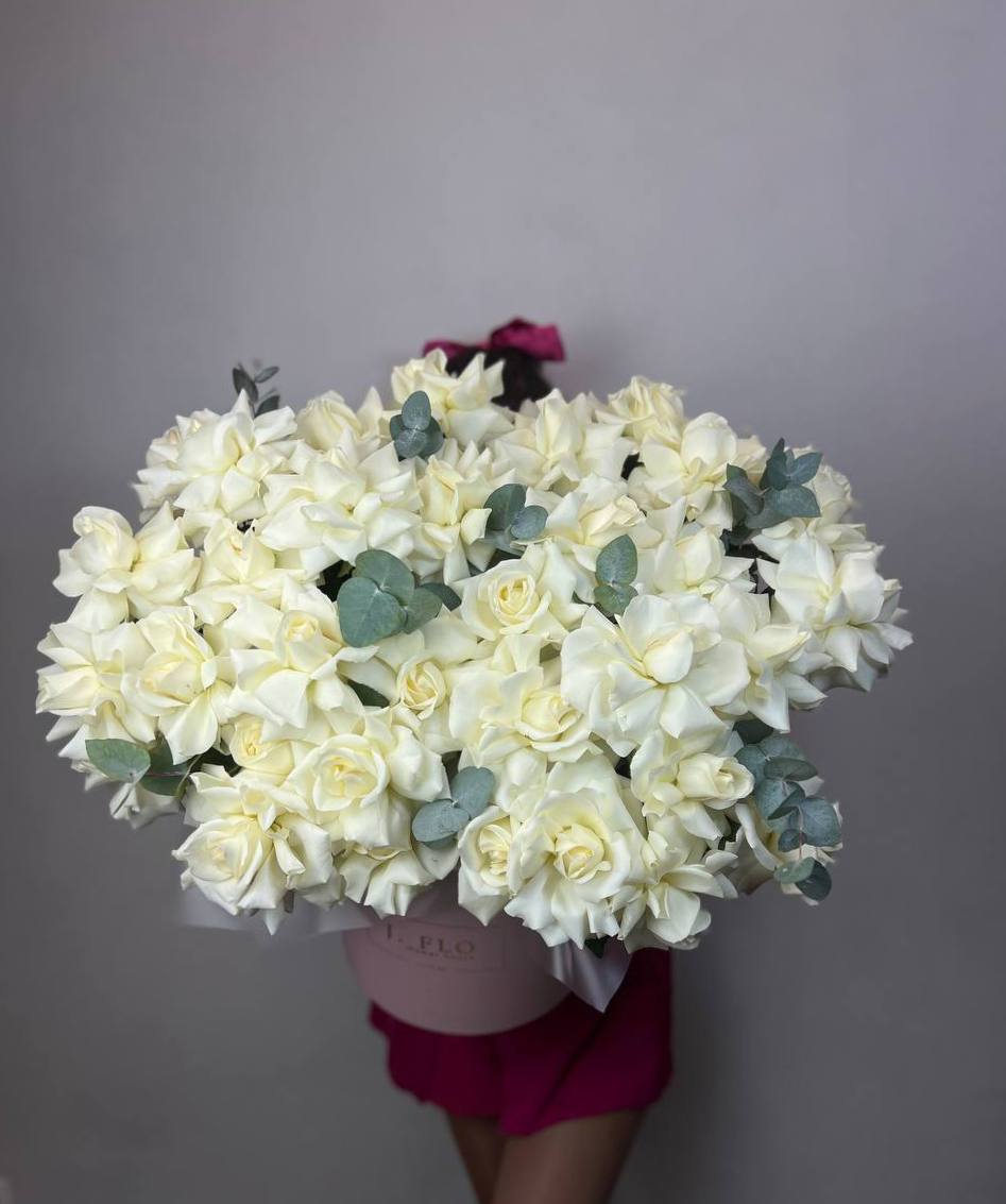 Тридцать семь белых французских роз собраны в круглый бокс с ветками эвкалипта. Плотная укладка бутонов создает объемную композицию, где каждый цветок виден и держит форму. Безупречное решение для яркого события.