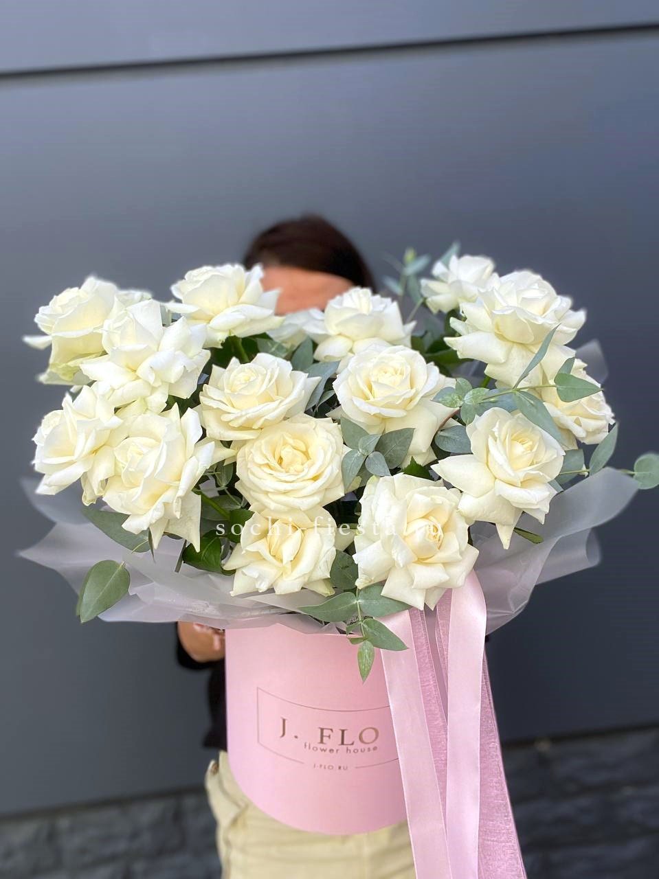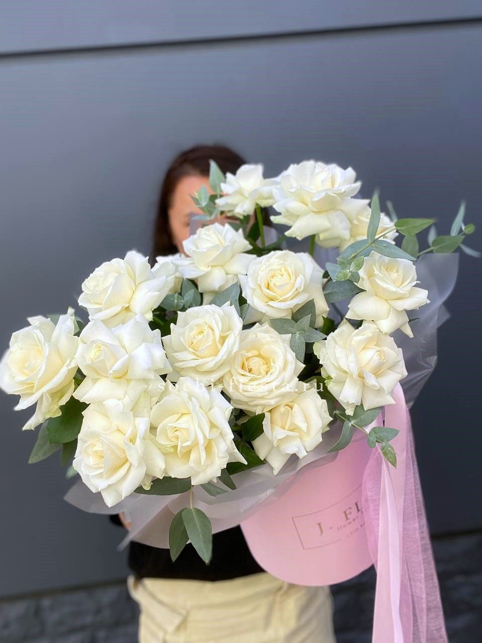 белые французские розы в боксе с эвкалиптом.
