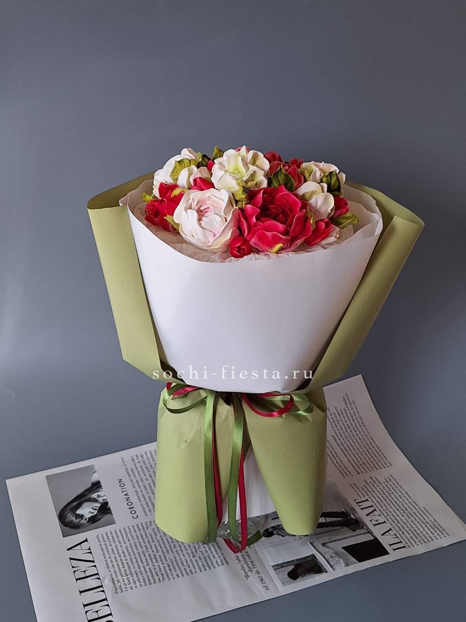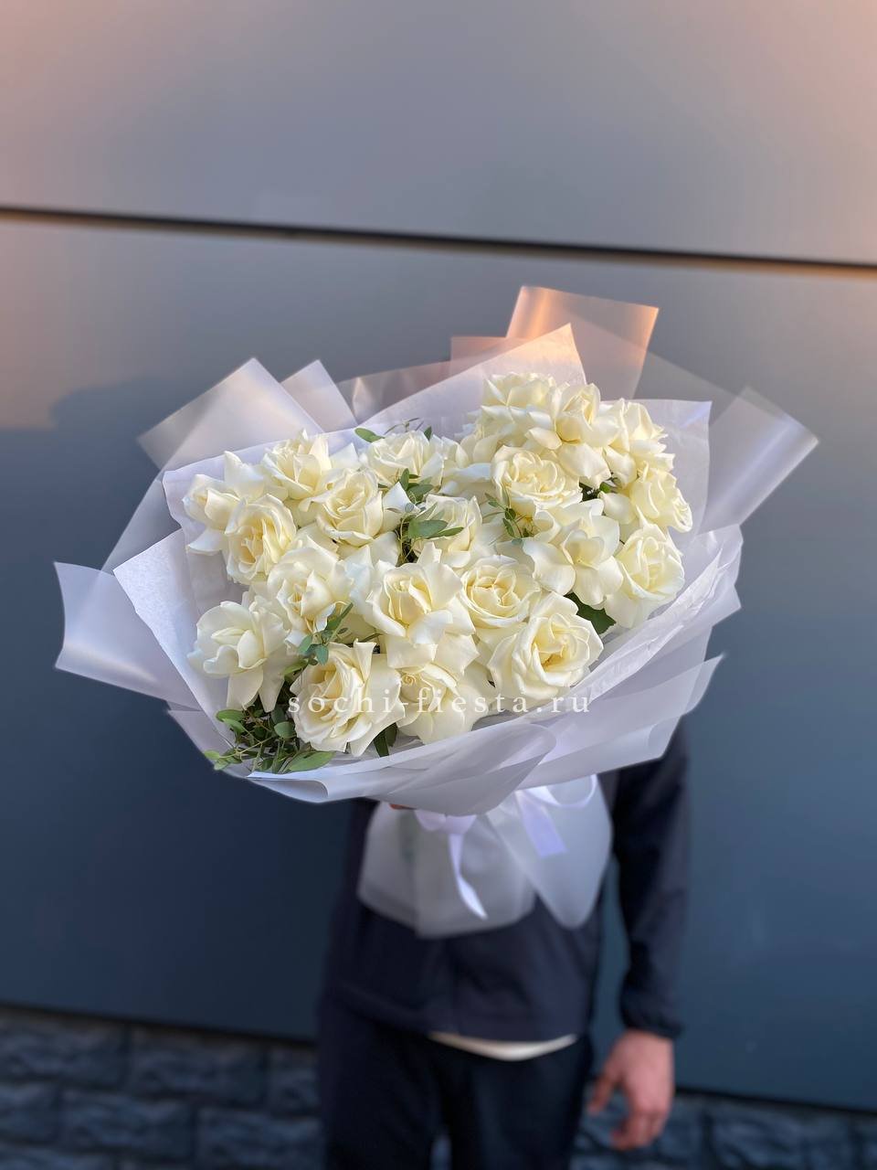 французские розы - 21 шт., эвкалипт - 2шт., лента, авторская упаковка.