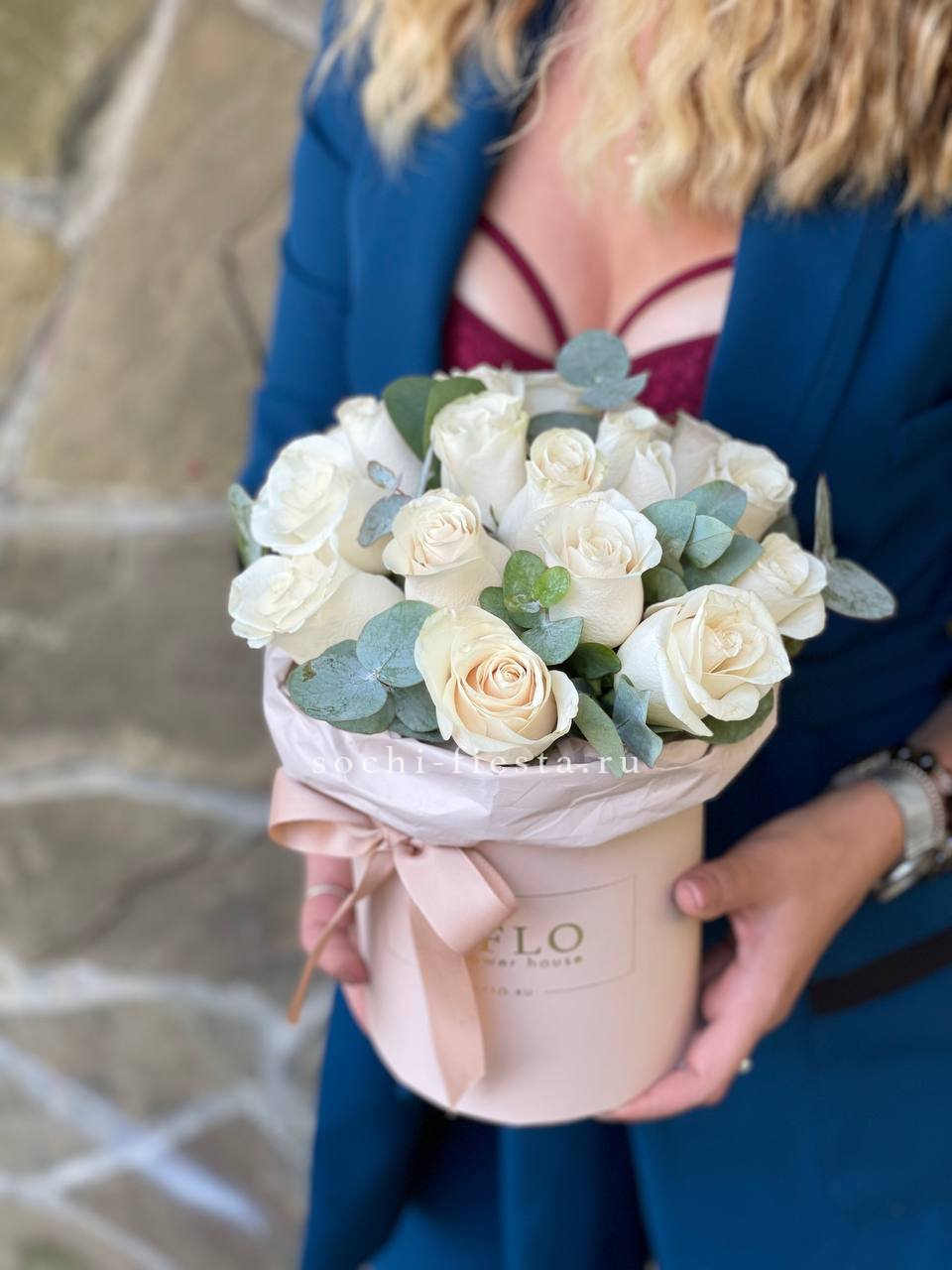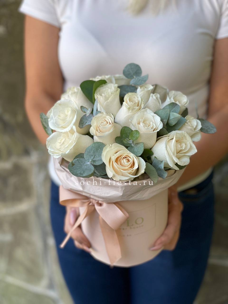 Французские розы раскрываются широко, создавая воздушный объем. Серебристые ветви эвкалипта добавляют глубину и легкость композиции. Свежий акцент для любого пространства.