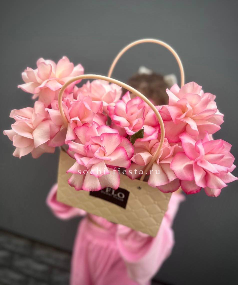 Вывернутые розы открывают всю глубину бутона и создают объёмную фактуру. Каждый лепесток развернут наружу, обнажая сердцевину. Розовый оттенок звучит свежо и современно.