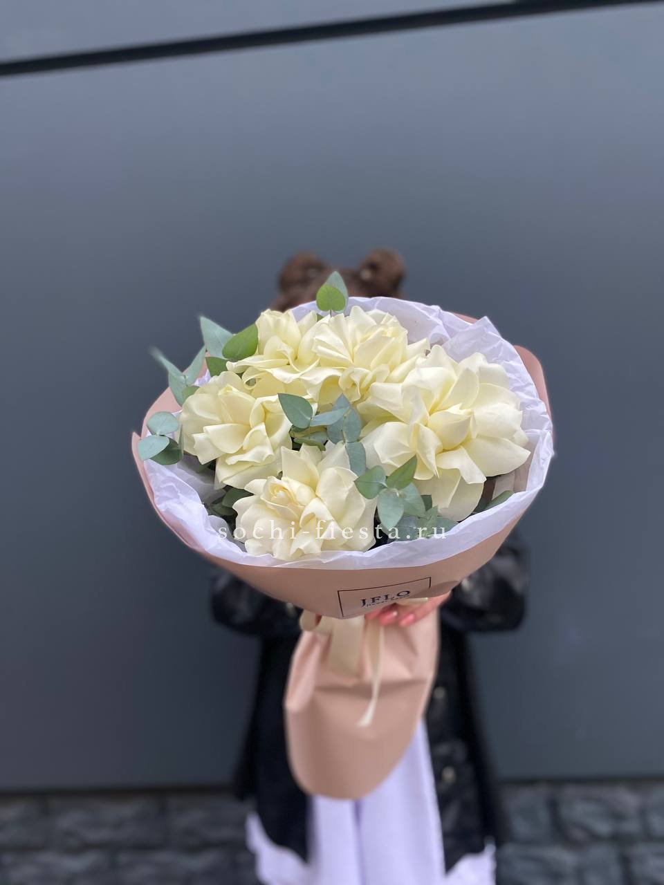 Пять французских роз с вывернутыми лепестками раскрываются широко и создают эффект лёгкой небрежности. Эвкалипт поддерживает форму и добавляет свежести белому цвету.