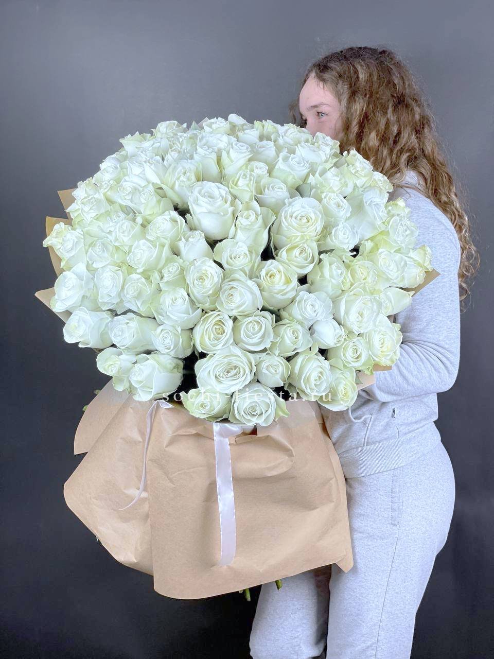 Тридцать один белоснежный бутон собран в высокий монохромный букет с чистым силуэтом. Голландские розы образуют плотную воздушную форму и впечатляют присутствием в любом пространстве.