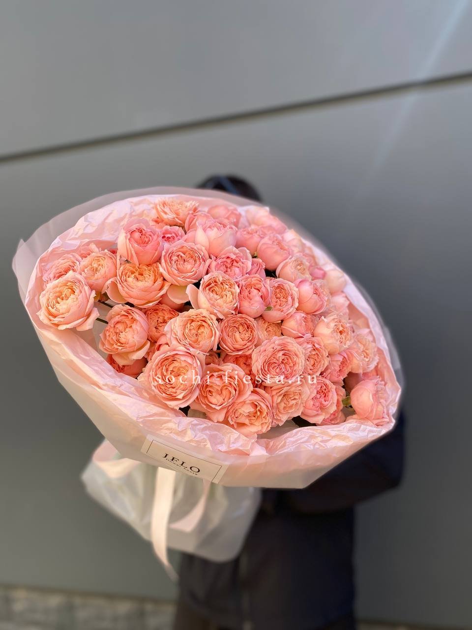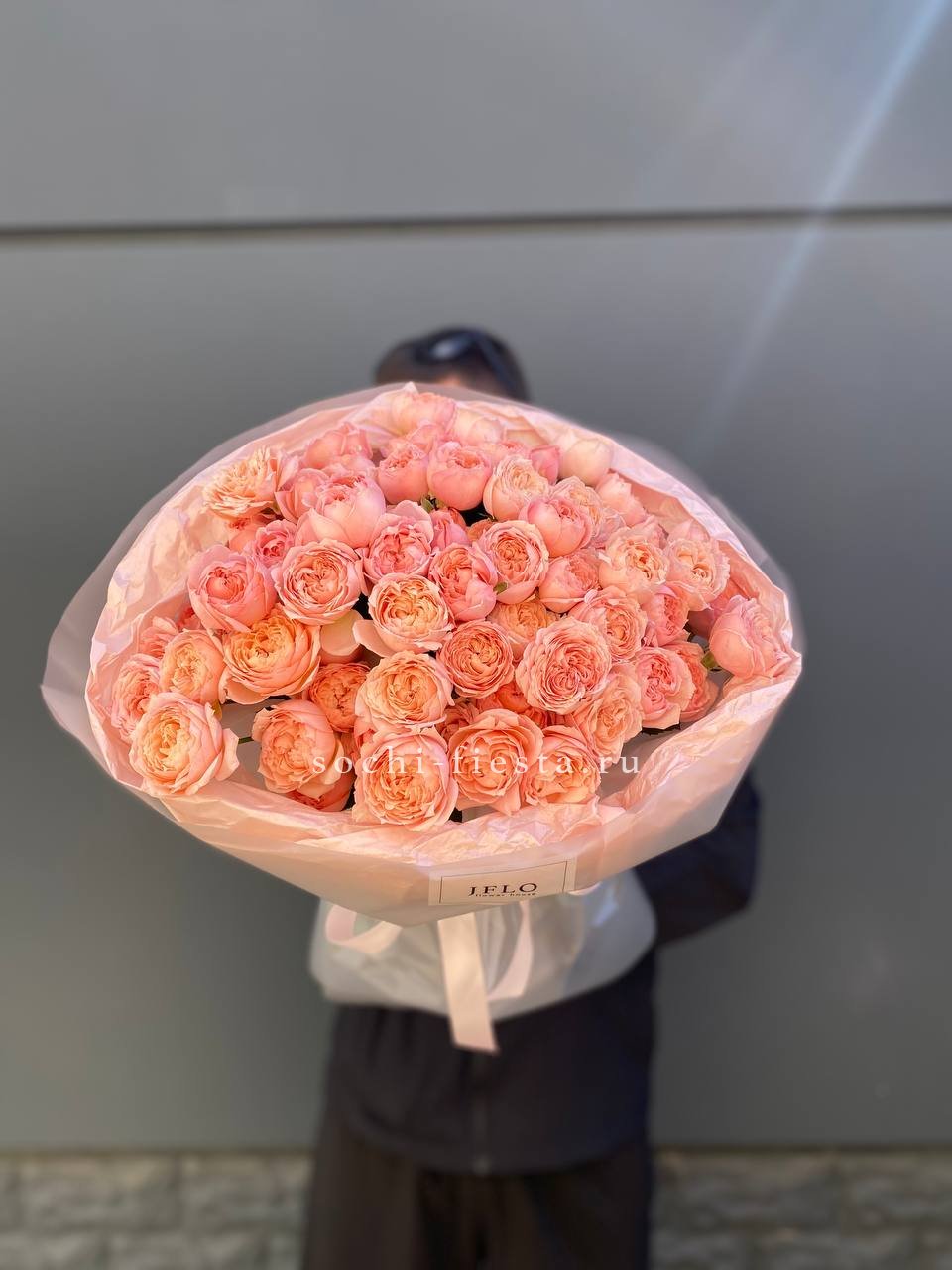 Двадцать одна головка с пышными лепестками формируют округлый силуэт без пустот. Букет держит форму за счёт плотности бутонов, а их равномерное распределение создаёт ритмичную, собранную картину.