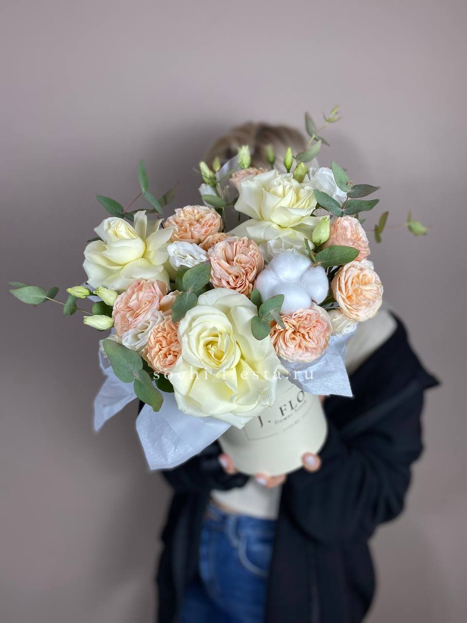 кустовая пионовидная роза, лента, дизайнерская упаковка.