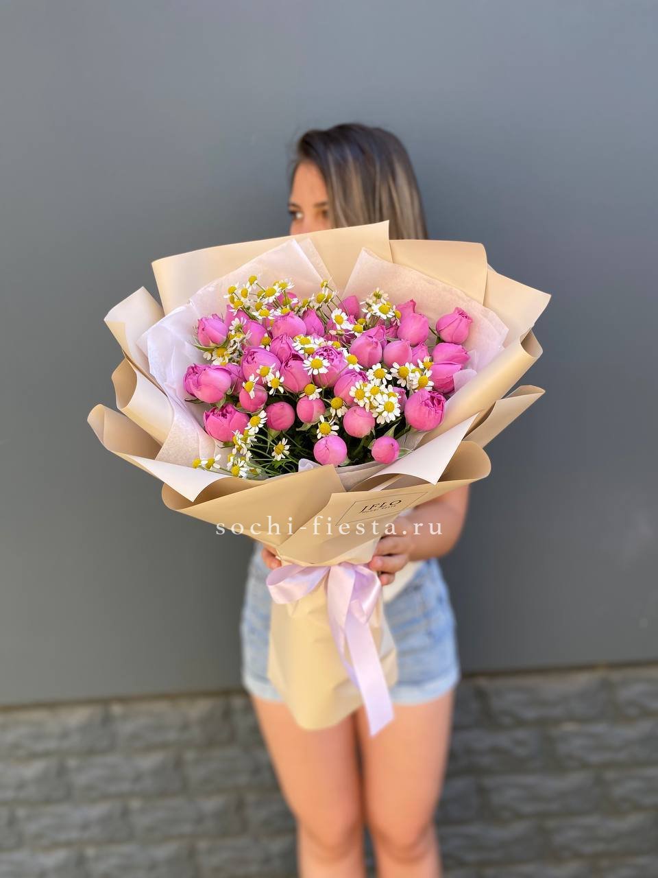 кустовые розы мисти бабблс, ромашки, лента, упаковка.