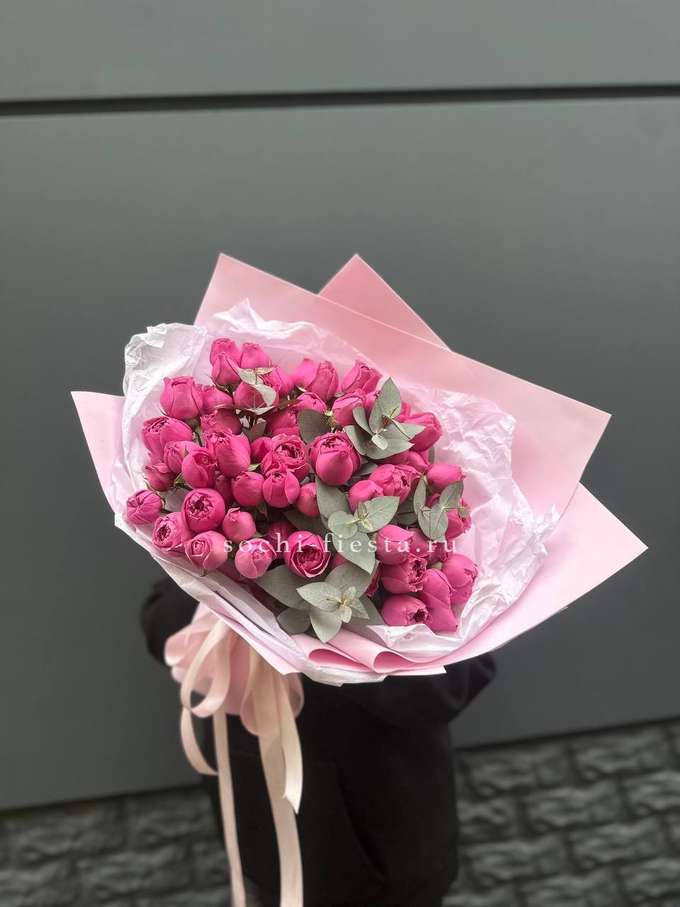 Пятнадцать роз Мисти Бабблс с пышными многослойными бутонами создают объёмную композицию с живой текстурой. Лепестки раскрываются волнами, образуя плотную шапку с мягкими переходами оттенков. Веточка эвкалипта добавляет свежести и завершает образ.