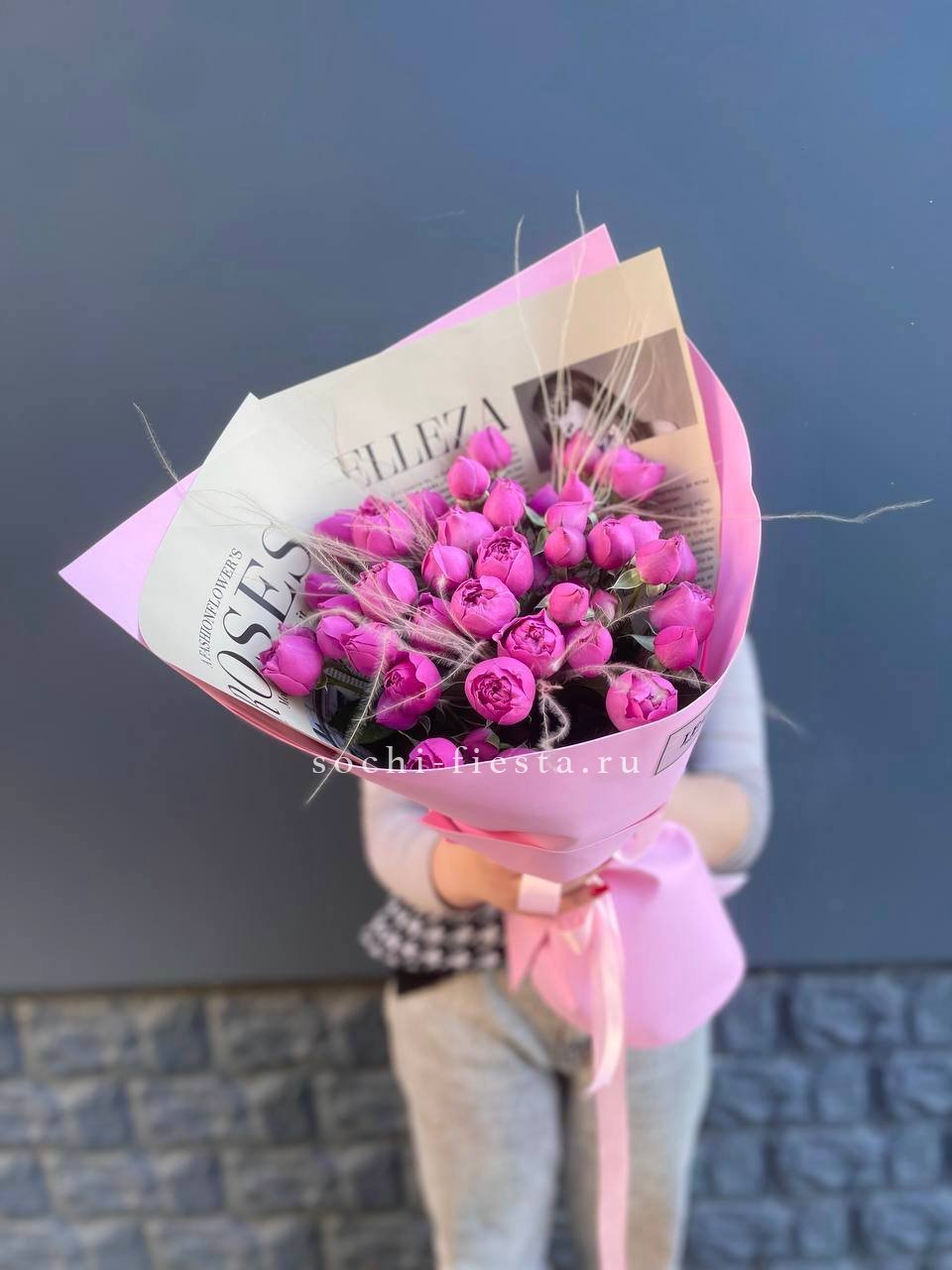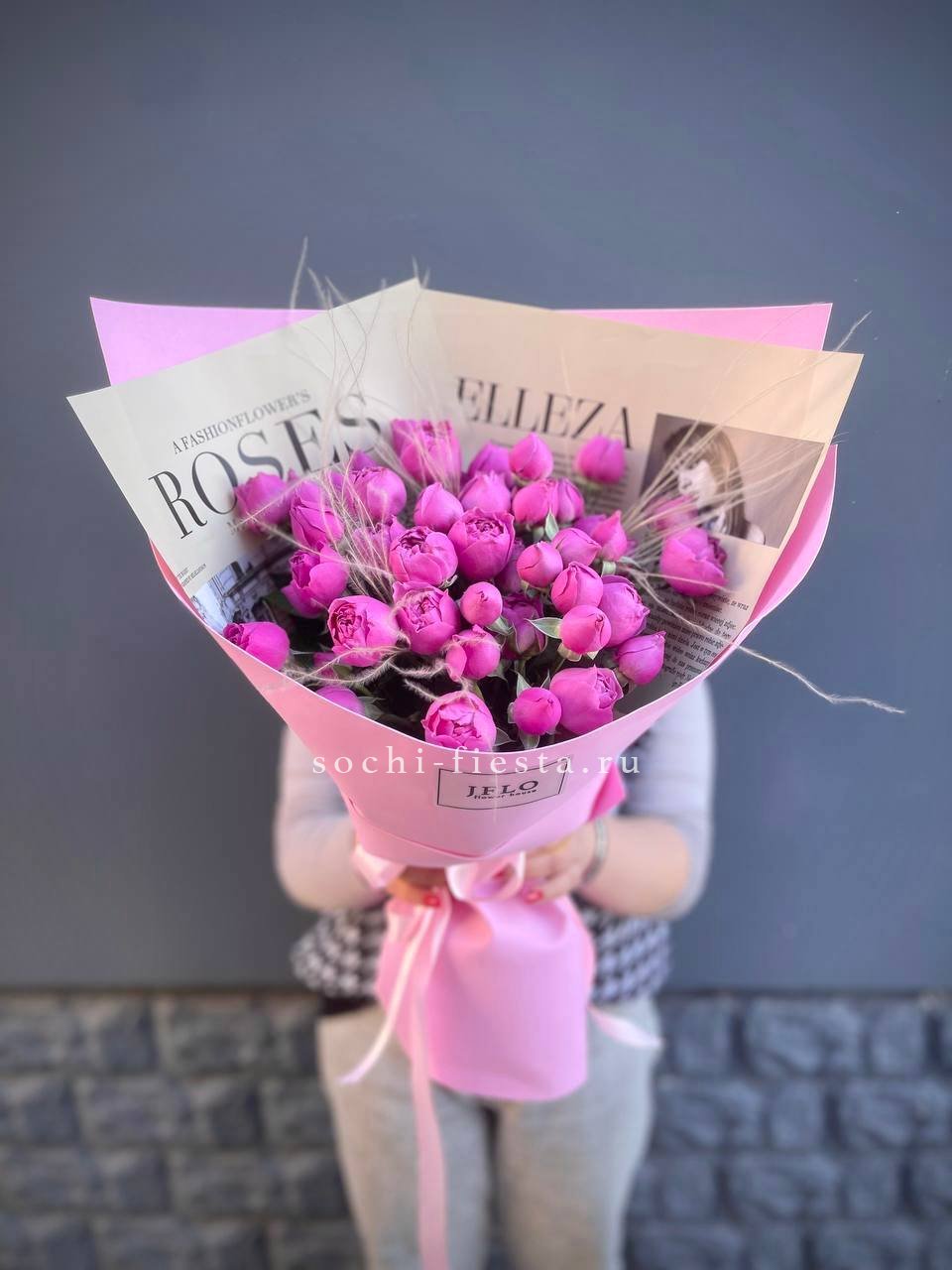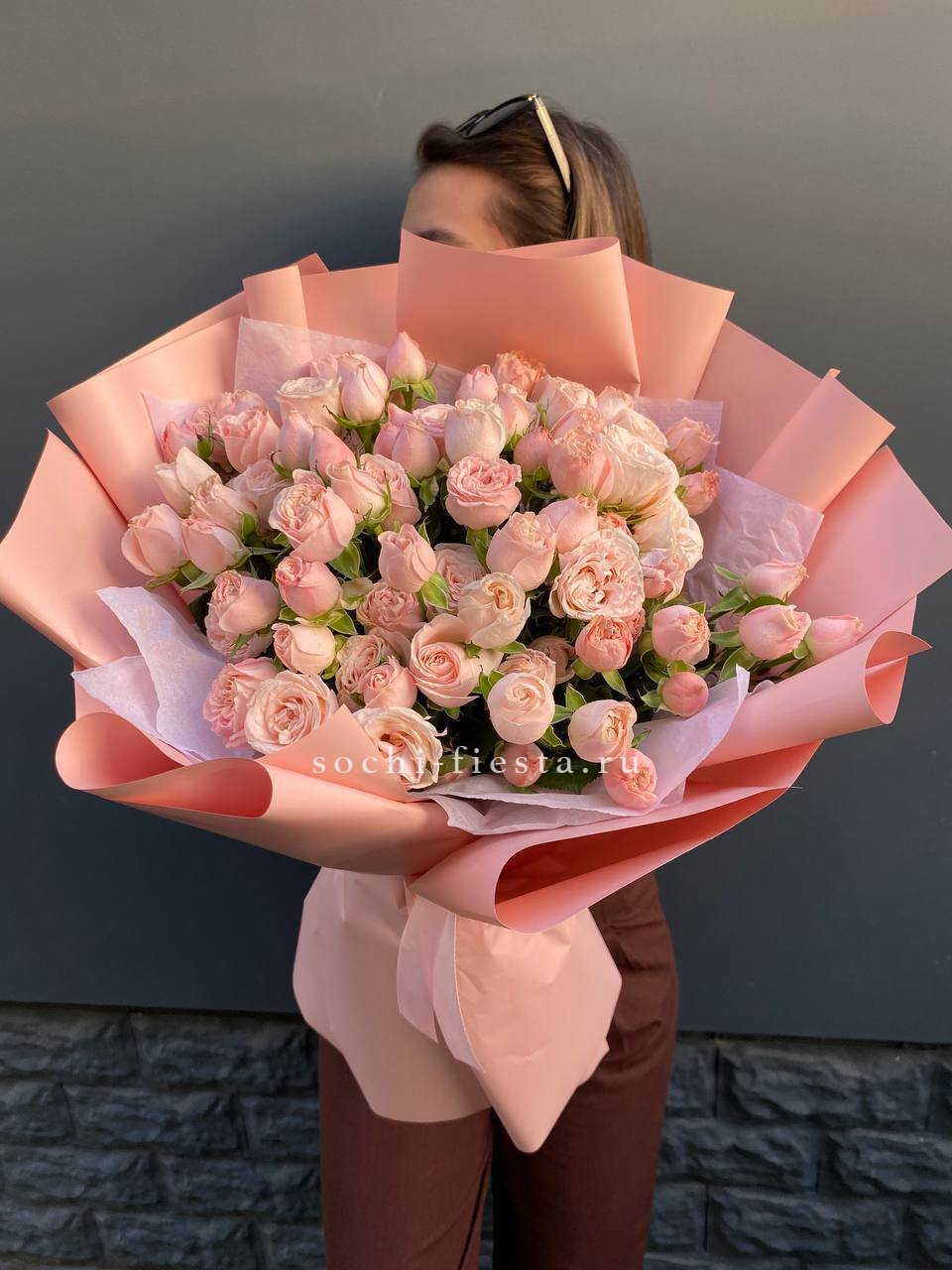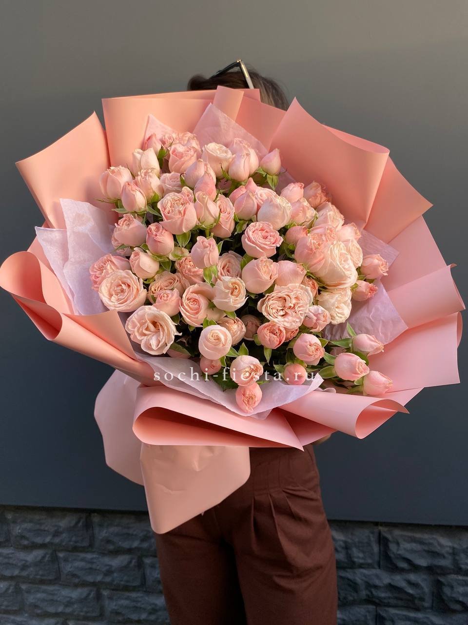 11 пионовидных кустовых роз Bombastic (или Porcelain Lace), дизайнерское оформление, лента.