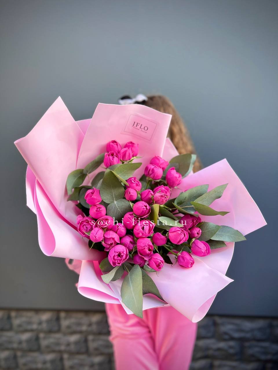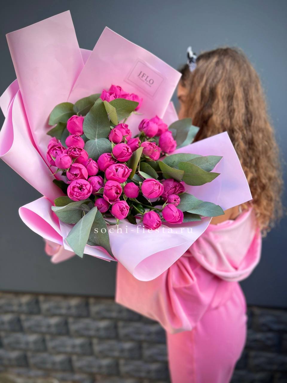 розы пионовидные 21шт, эвкалипт, пленка, лента.