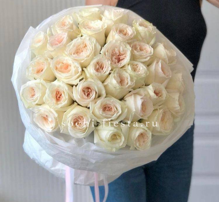 Двадцать один бутон O'hara с пышными лепестками раскрывается слоями кремового оттенка. Веточки эвкалипта вплетаются между соцветиями и добавляют воздуха всей композиции.