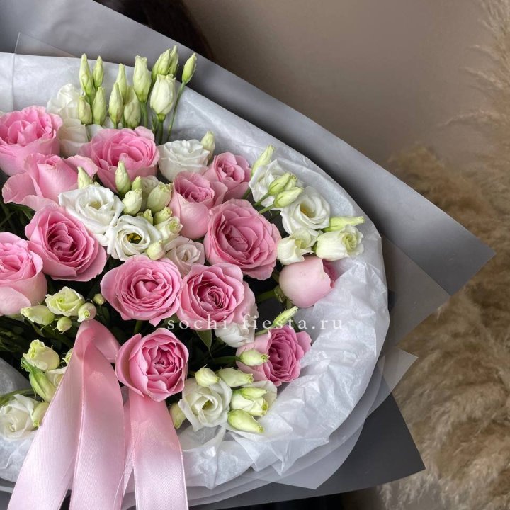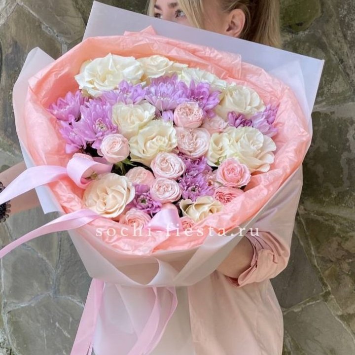 сборный букет из роз хризантем и эустомы для подарка в городе регионального уровня