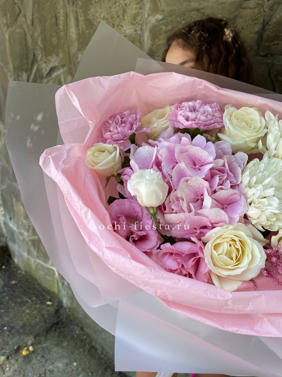 Мисти Баблс раскрывается плотными лепестками среди белоснежной гортензии и эустомы. Композиция построена на игре фактур — от крупных бутонов до мелких соцветий кустовой розы.