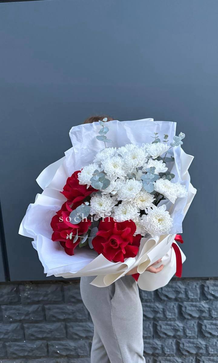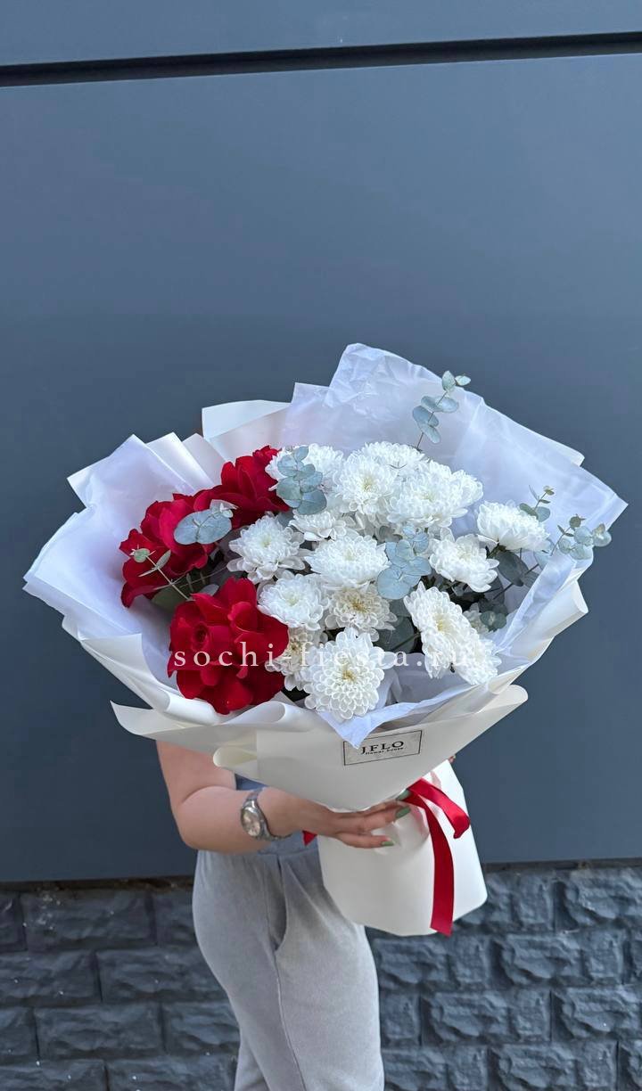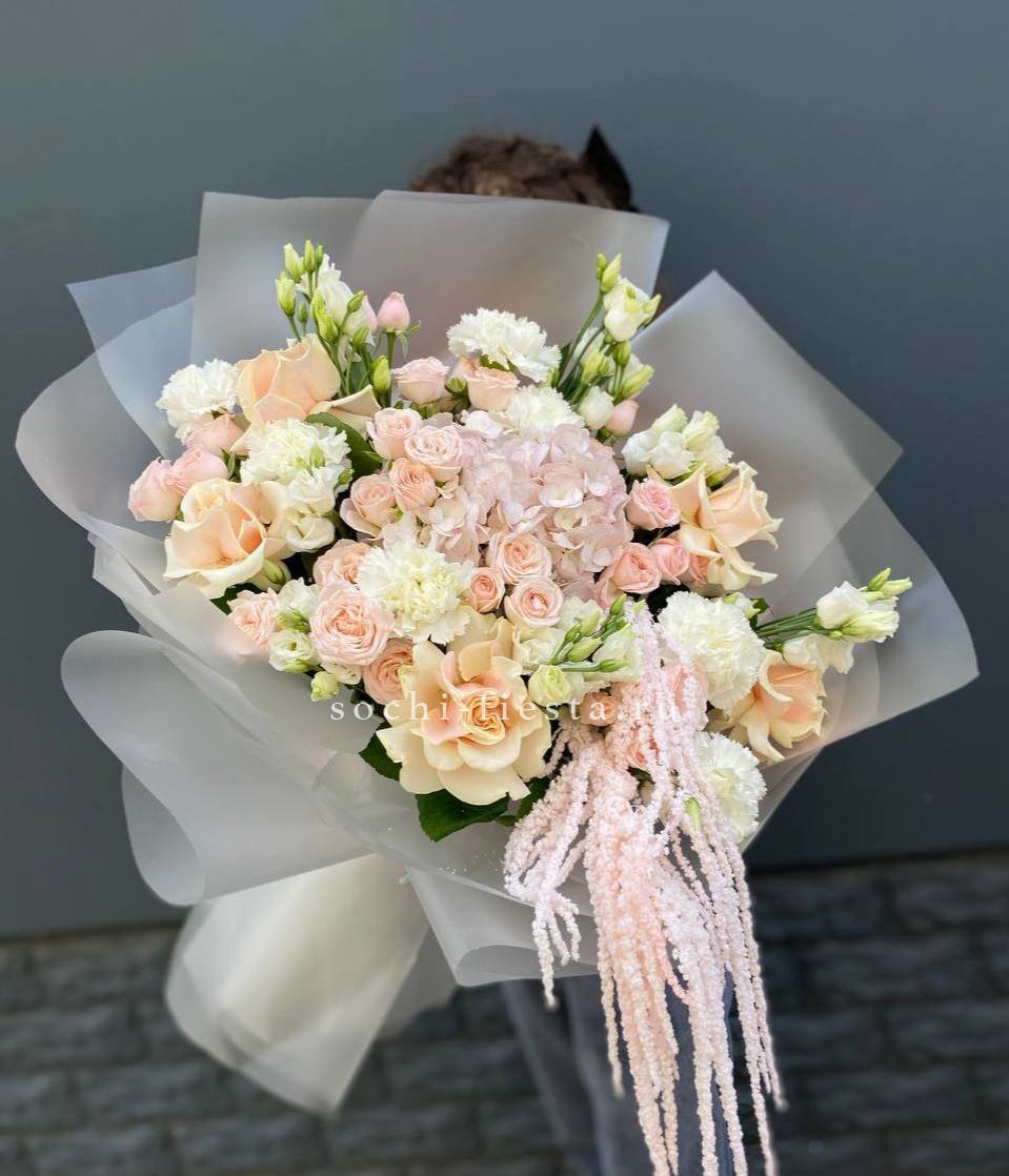 кустовые розы, гортензии, диантусы, эустома, амарант, лента и дизайнерская пленка.