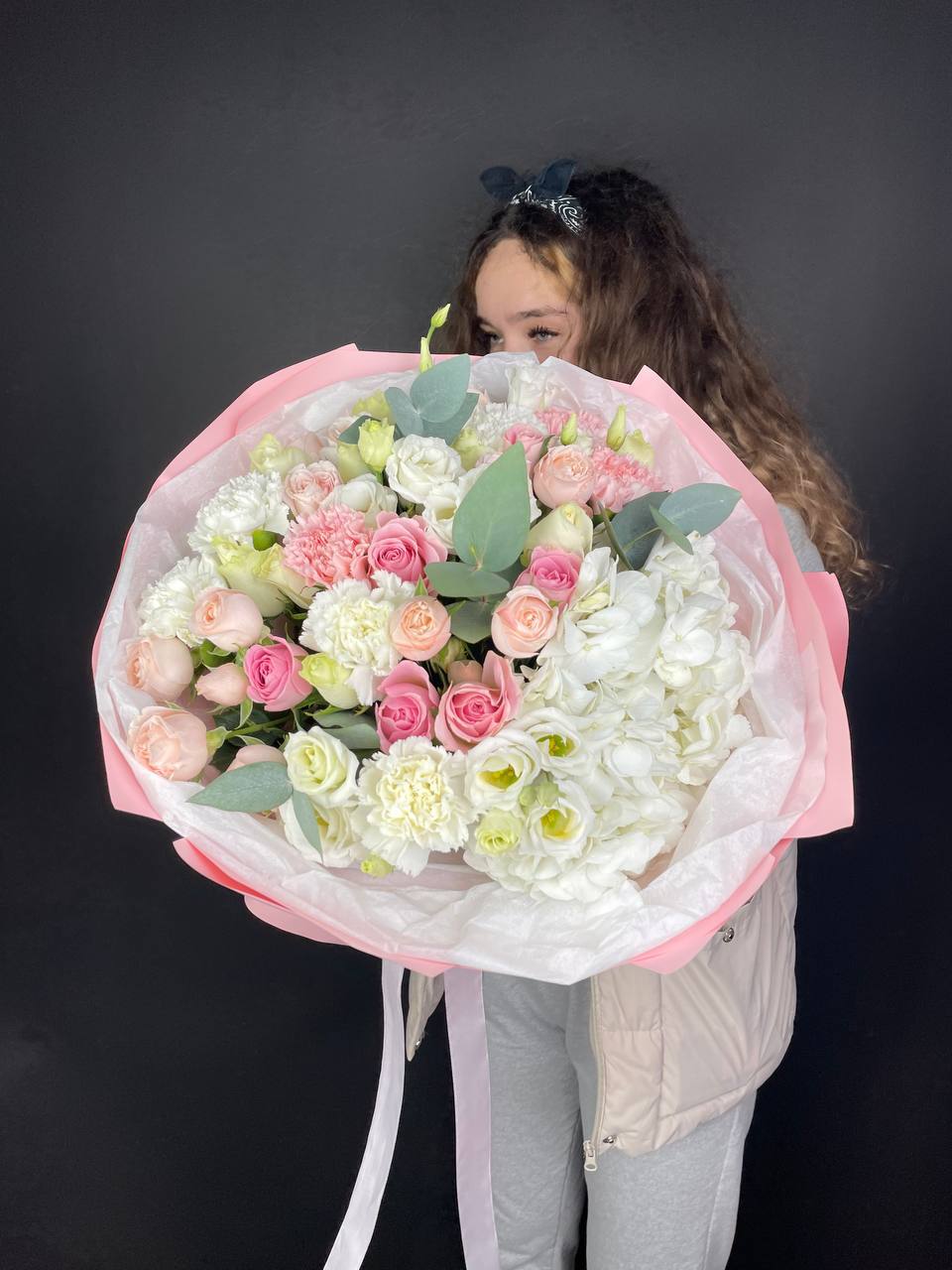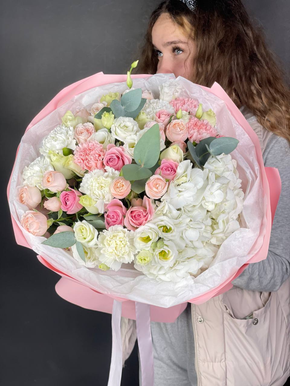 Плотная сборка с пышными соцветиями гортензии и яркими герберами создает объемный силуэт. Маттиола и лимониум добавляют воздушности по краям, а диантусы заполняют центр мягкими переходами.