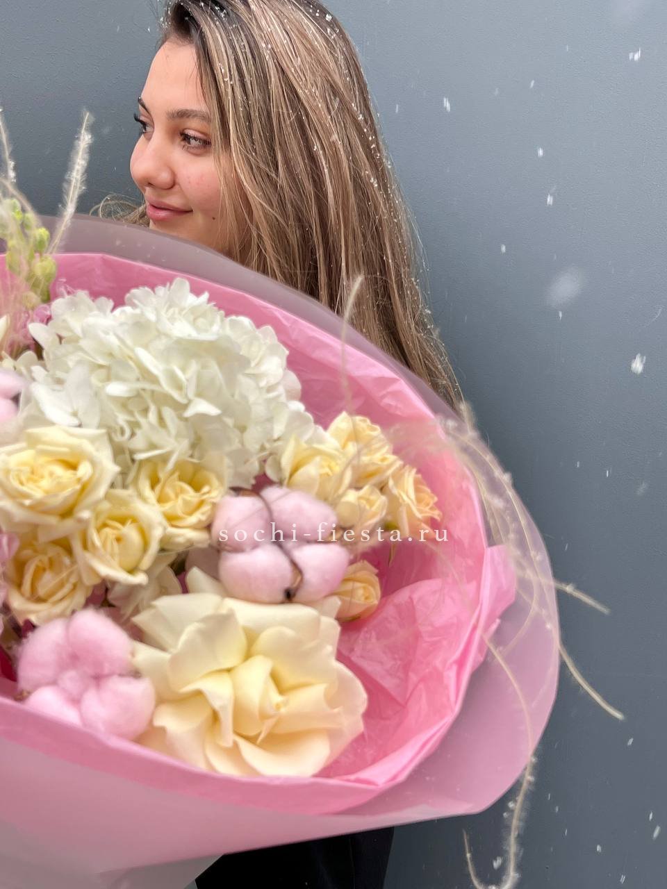 Белые французские розы переплетаются с пушистыми соцветиями маттиолы и хлопка. Гортензия и пионовидные бутоны создают объём, а ковыль вносит лёгкую небрежность в общий ритм.