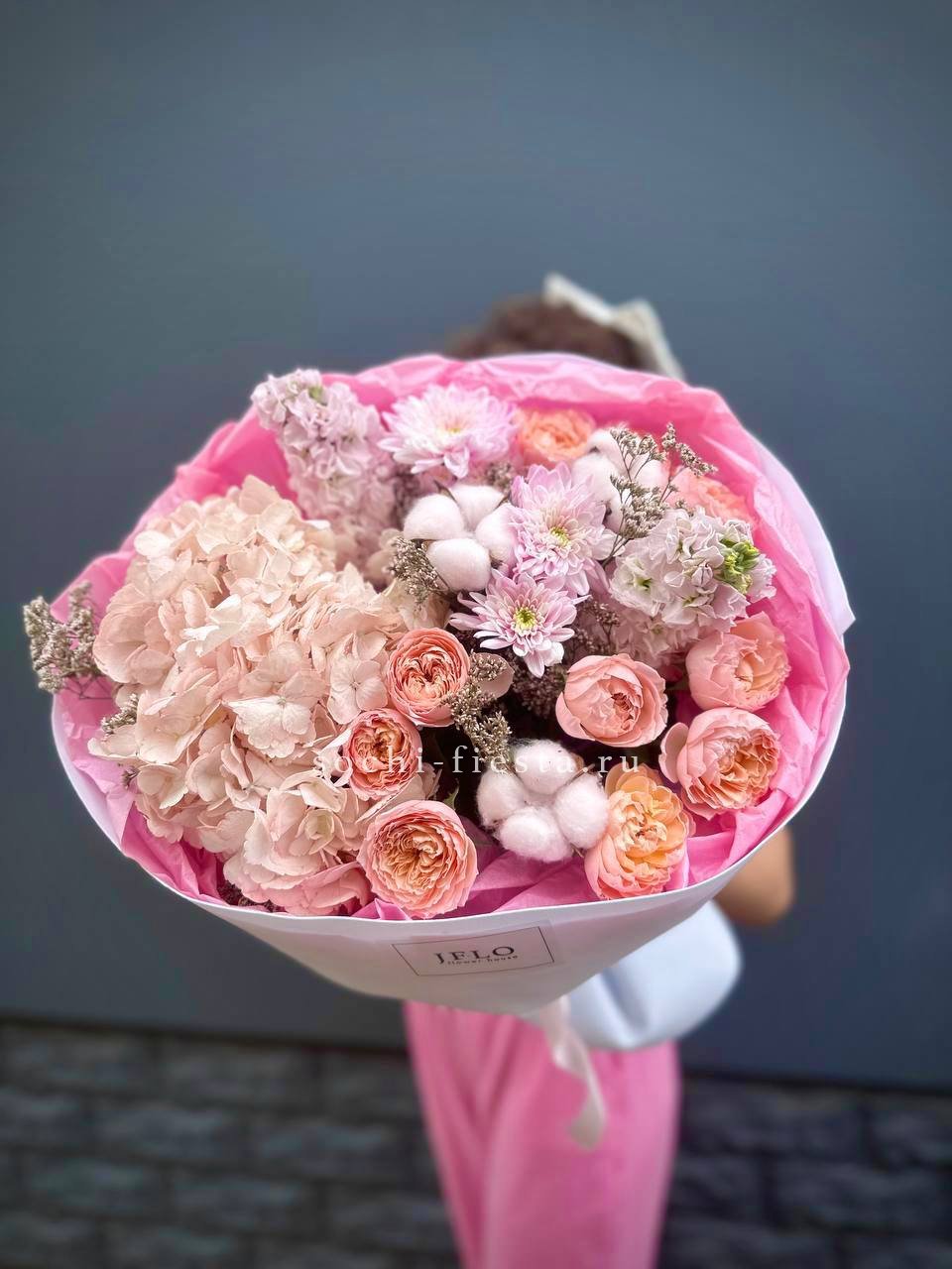 гортензия, маттиола, кустовые пионовидные розы Джульетта (аналог), хризантема кустовая, хлопок, лимониум (аналог), дизайнерская упаковка.