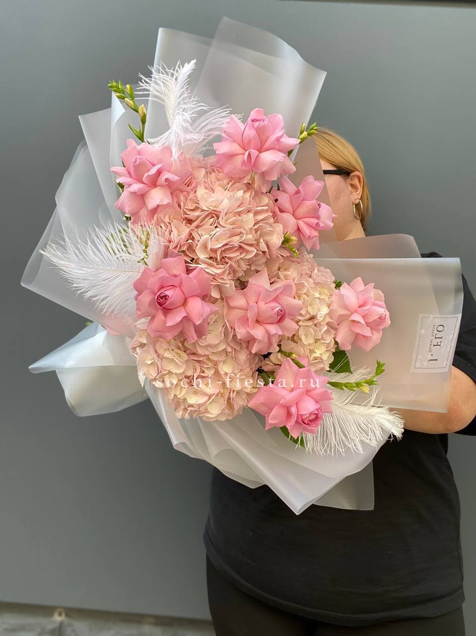 Пышные шапки гортензий создают воздушную основу, сквозь которую проступают розовые бутоны. Перья добавляют графичности и лёгкости всему силуэту.