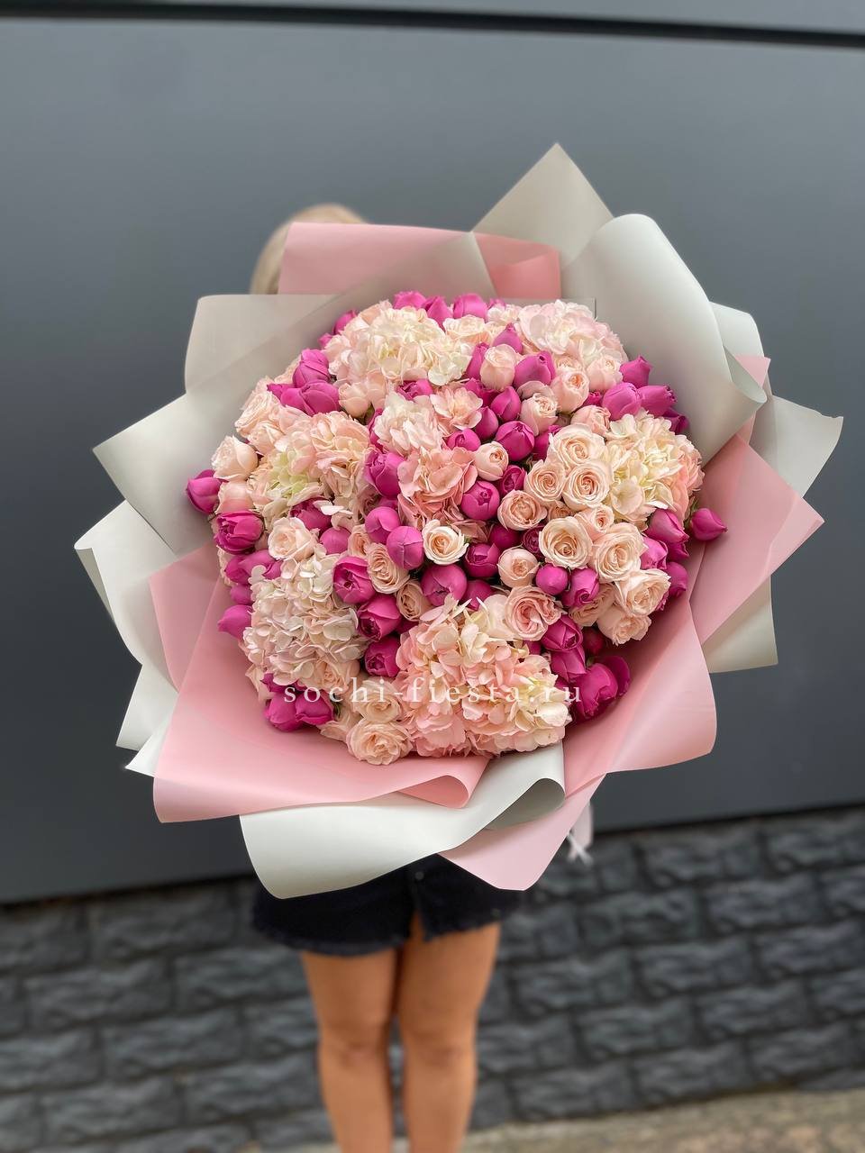 Пышные шапки гортензии задают объём, а россыпь кустовых роз создаёт живую текстуру по всей форме. Композиция наполнена воздухом и естественной лёгкостью.