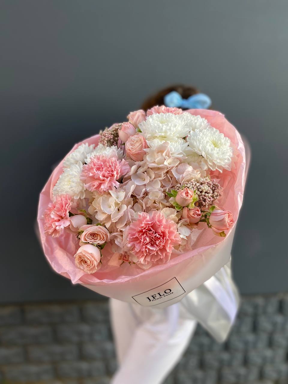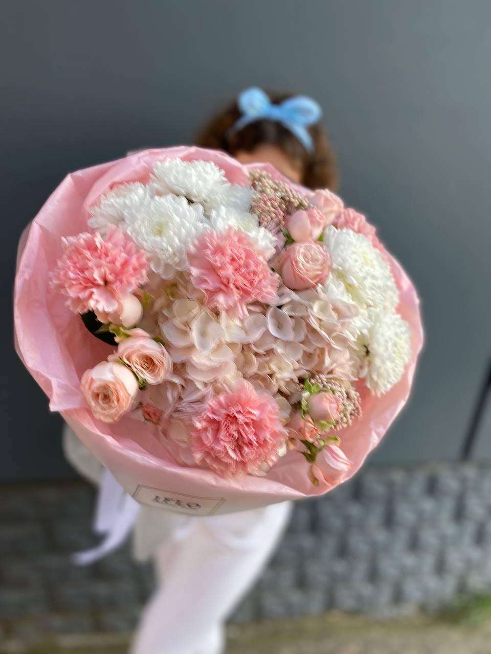 гортензия, диантус, хризантема, бомбастик, озатамус, пленка.