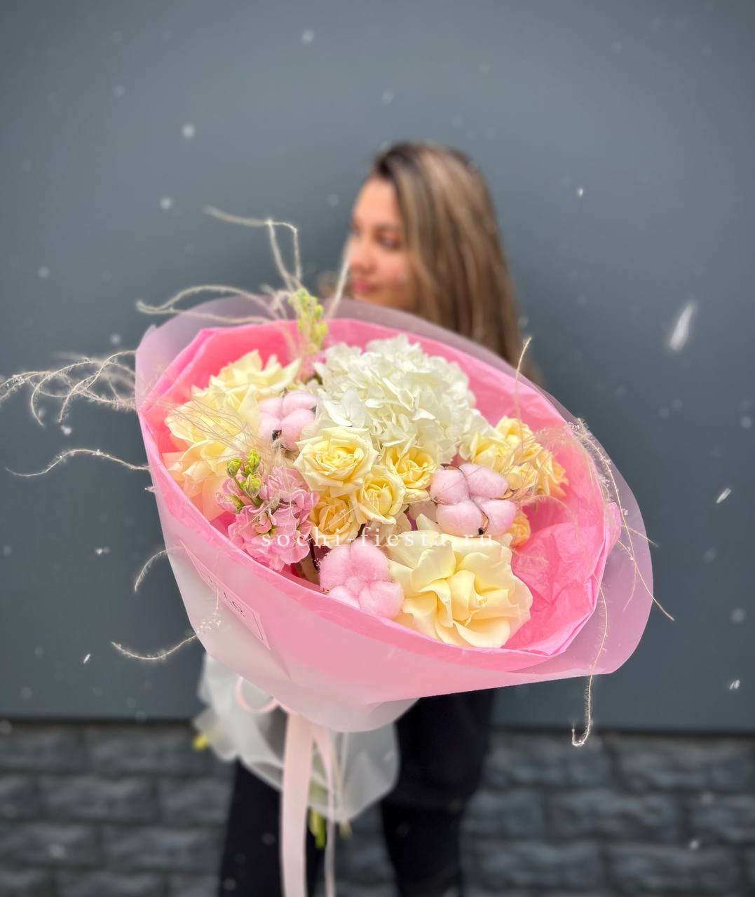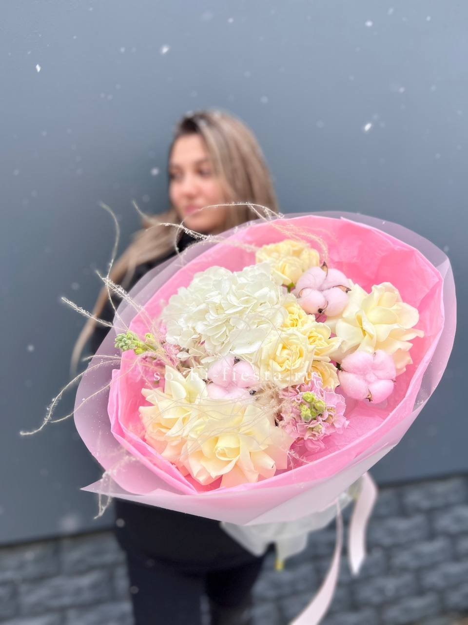 Воздушная композиция с крупными соцветиями гортензии и пышными розами создает ощущение легкости и объема. Эвкалипт добавляет свежести, а бомбастик расставляет яркие акценты между бутонами.
