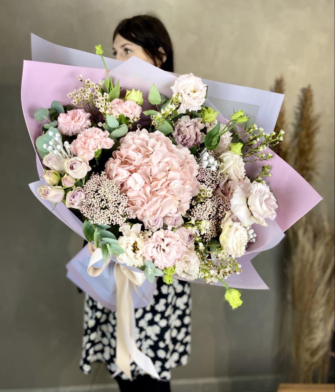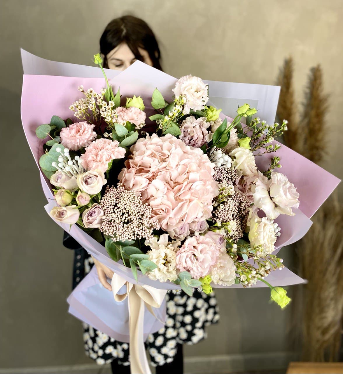 Кустовые розы и эустомы собраны в компактную форму с мягкими линиями. Сочетание нескольких оттенков создаёт живописный эффект без лишней пышности.