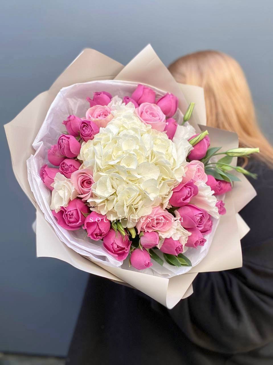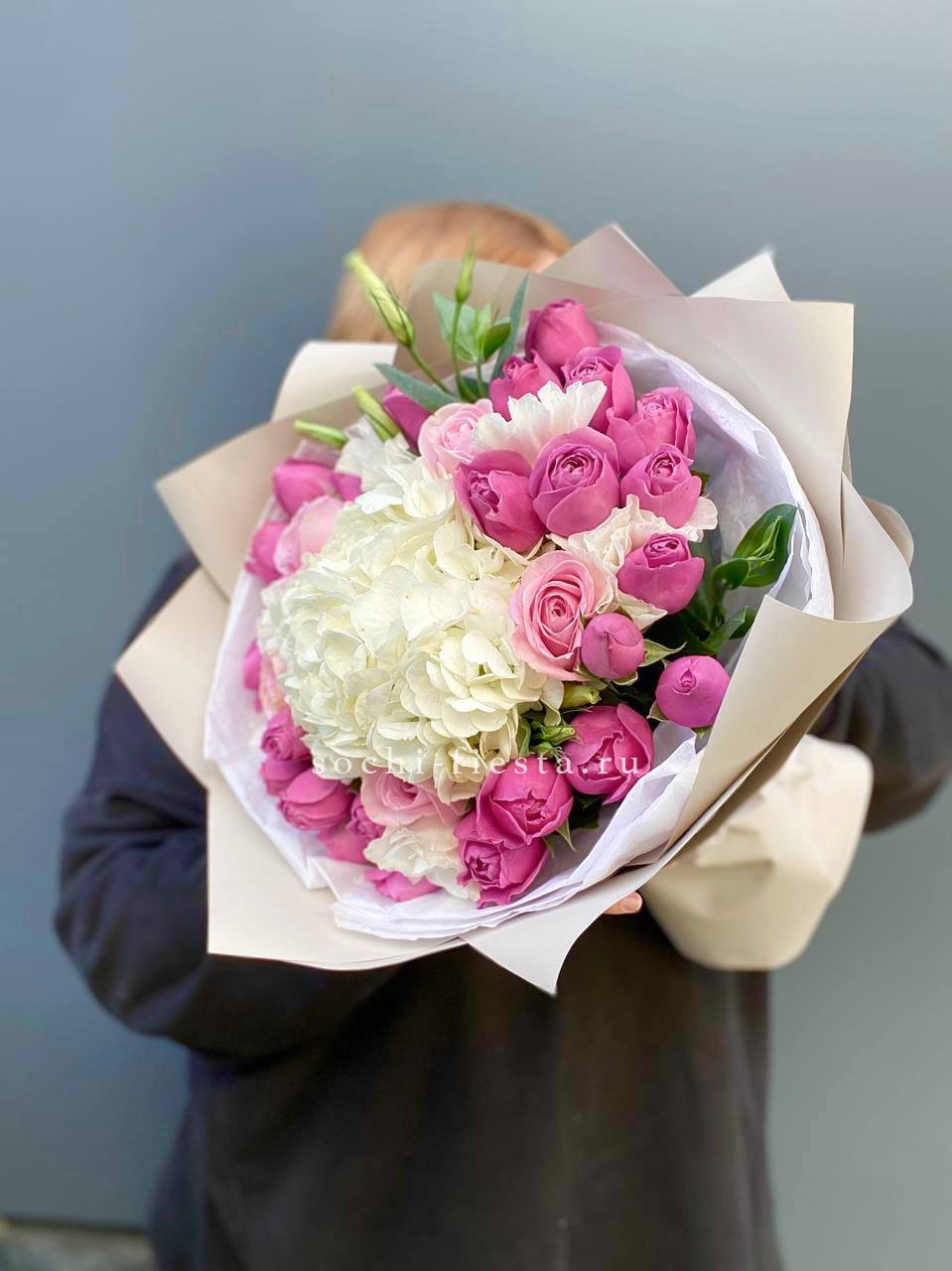 эвкалипт, гортензия, перо, кустовая роза, эустома, роза белая, диантус, упаковка.