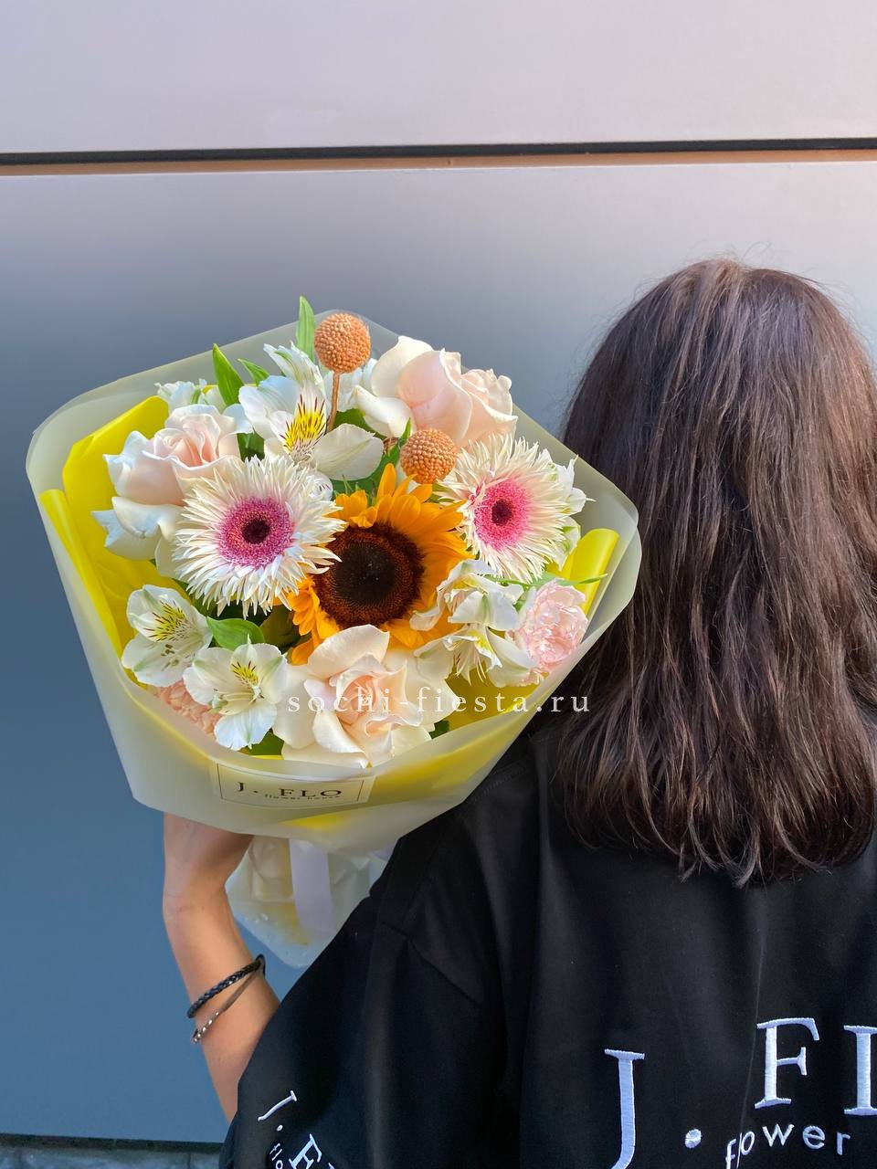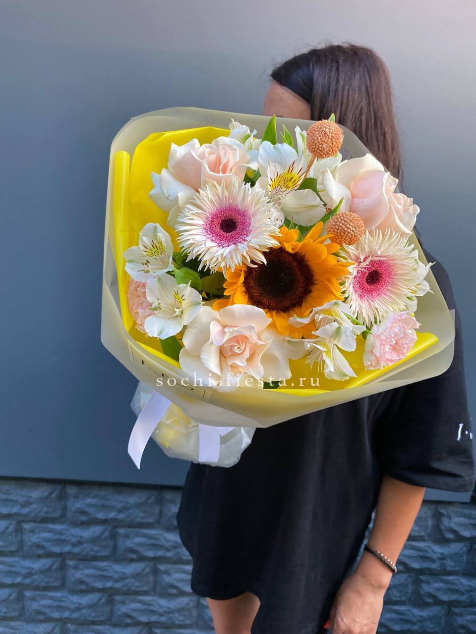 Солнечный подсолнух задает тон композиции, где желтые герберы и белые розы создают радостное настроение. Альстромерии и диантусы добавляют воздушности и завершают яркий летний образ.