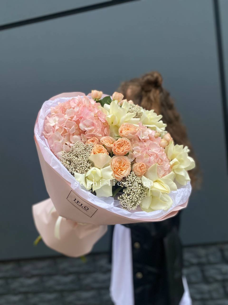 гортензия, пионовидная роза, озотамус, белая роза в нежном оформлении.