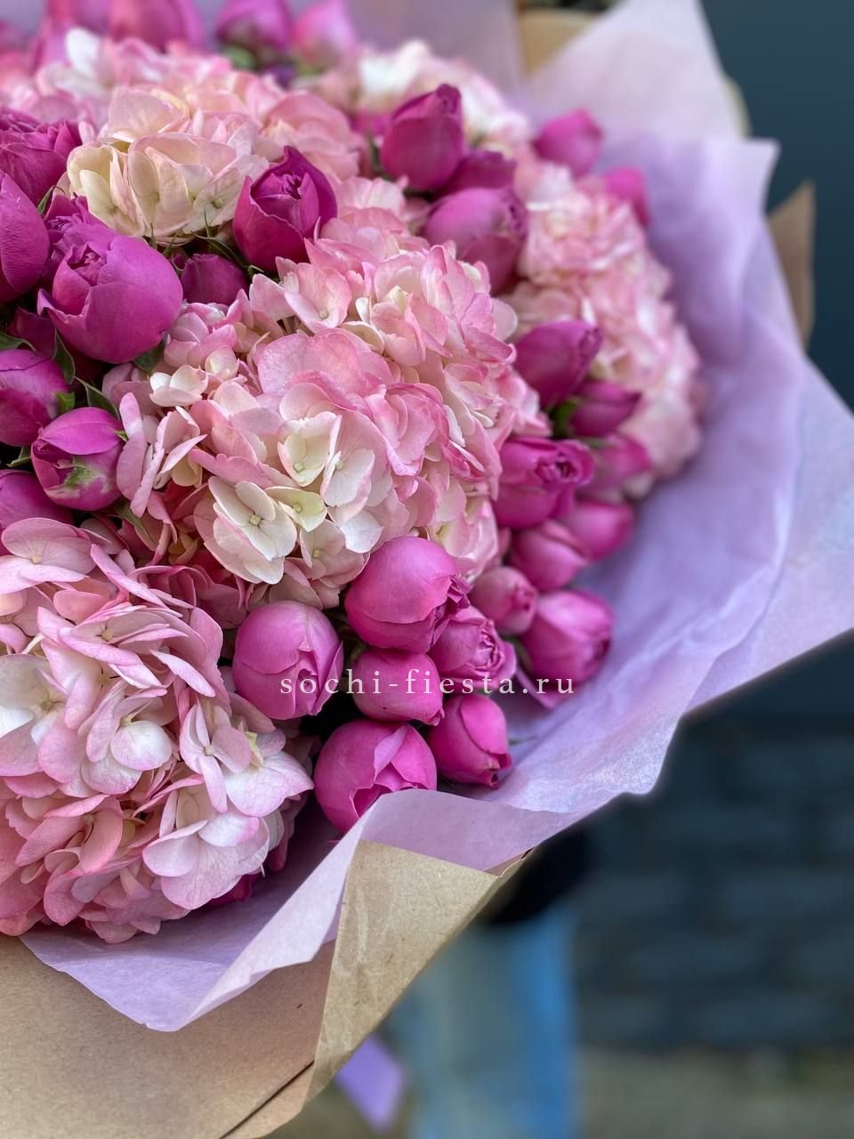 Плотная сборка с пышной гортензией в центре и рассыпчатыми соцветиями диантуса по краям. Эустома добавляет воздушности, а ветки озатамуса создают лёгкую графику. Букет держит форму и выглядит объёмно с любого ракурса.