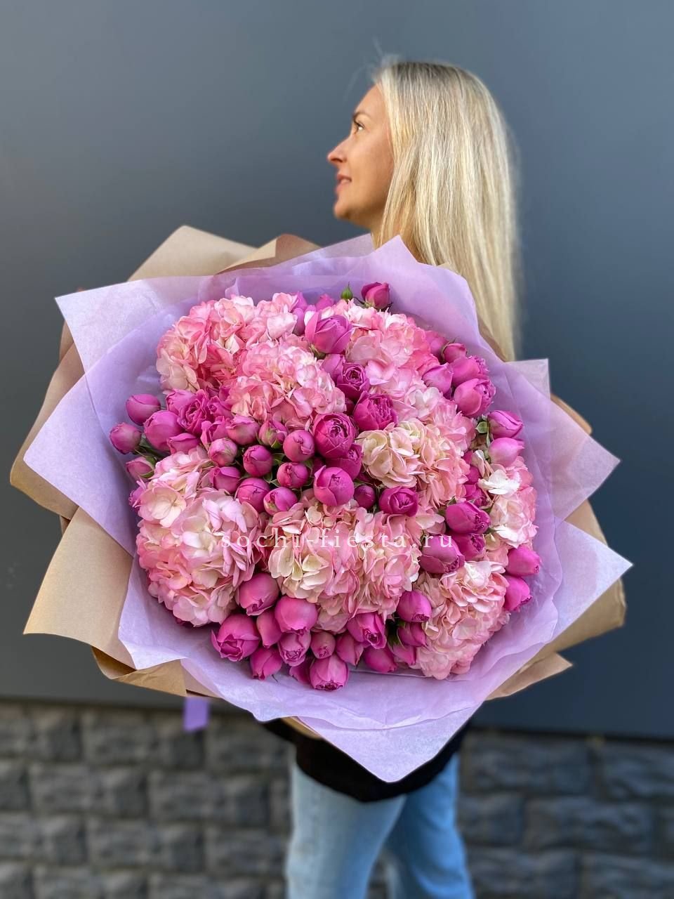 диантус, эустома, гортензия, хайди, эвкалипт, озатамус, пленка.